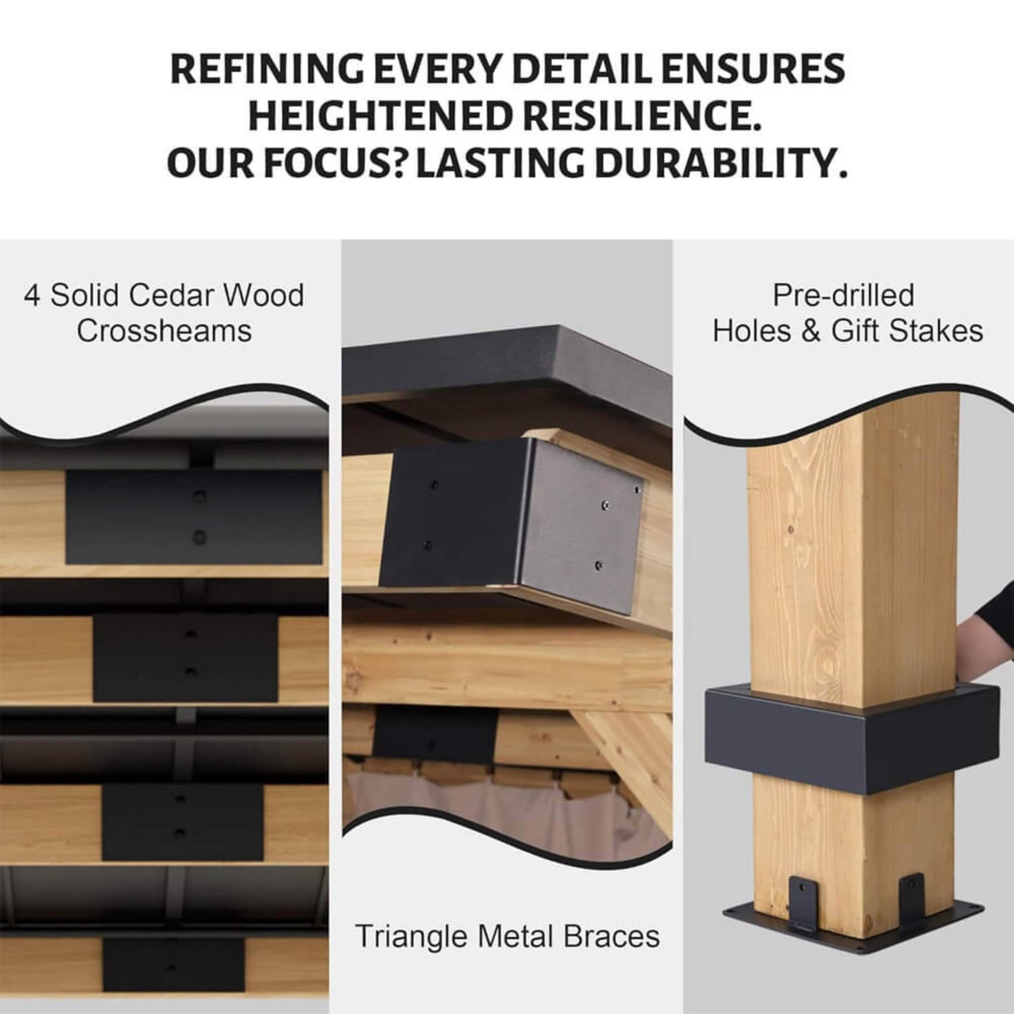 • The gazebo is reinforced with four solid wood beams and triangular metal brackets fixed to the front columns. Additionally, the wooden stakes inserted into pre-drilled holes add extra stability, allowing it to withstand strong winds and heavy snow.