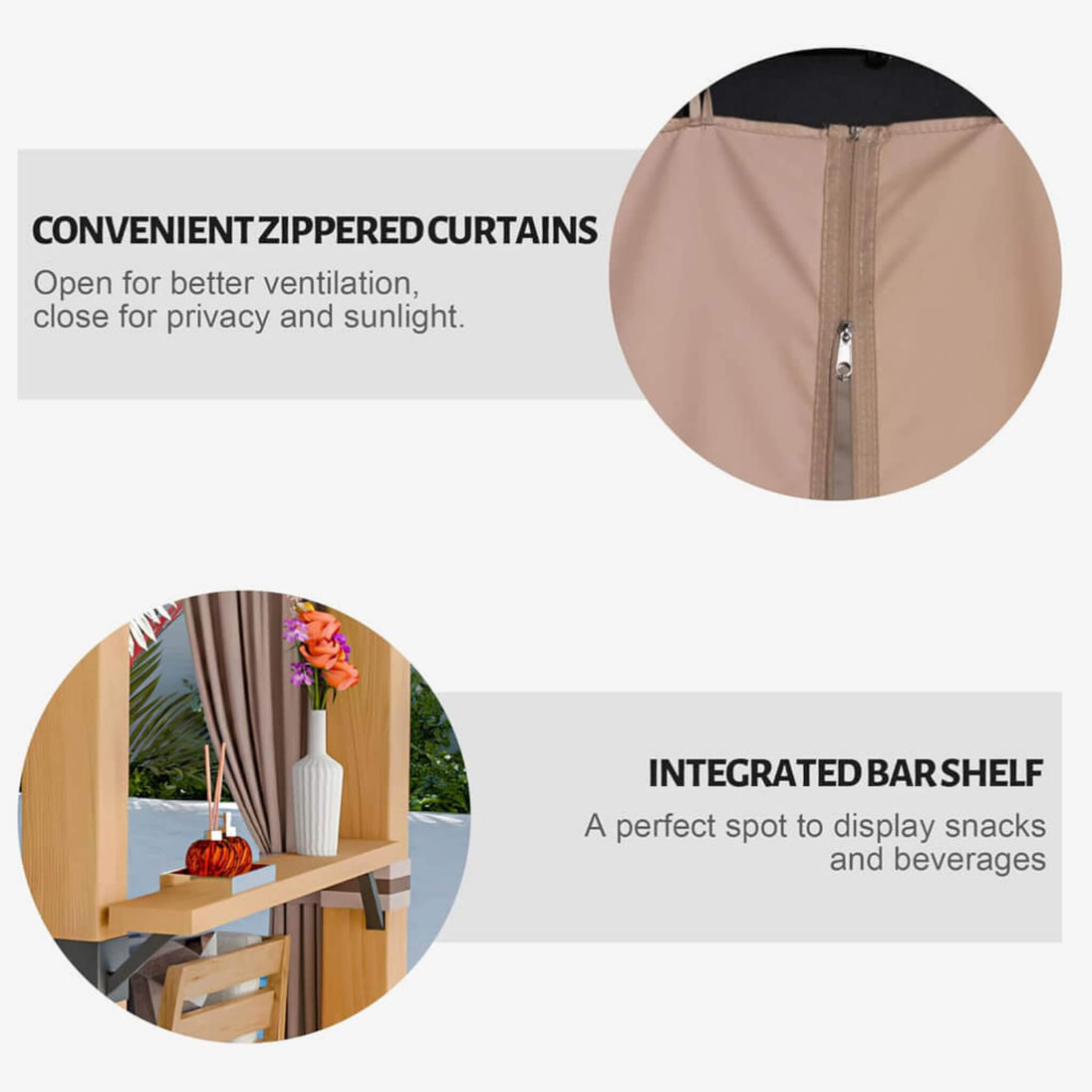 • Equipped with zippered curtains on one side, choose to remove them for optimal ventilation, tie them back for decorative purposes, or fully close them for privacy and sun protection.