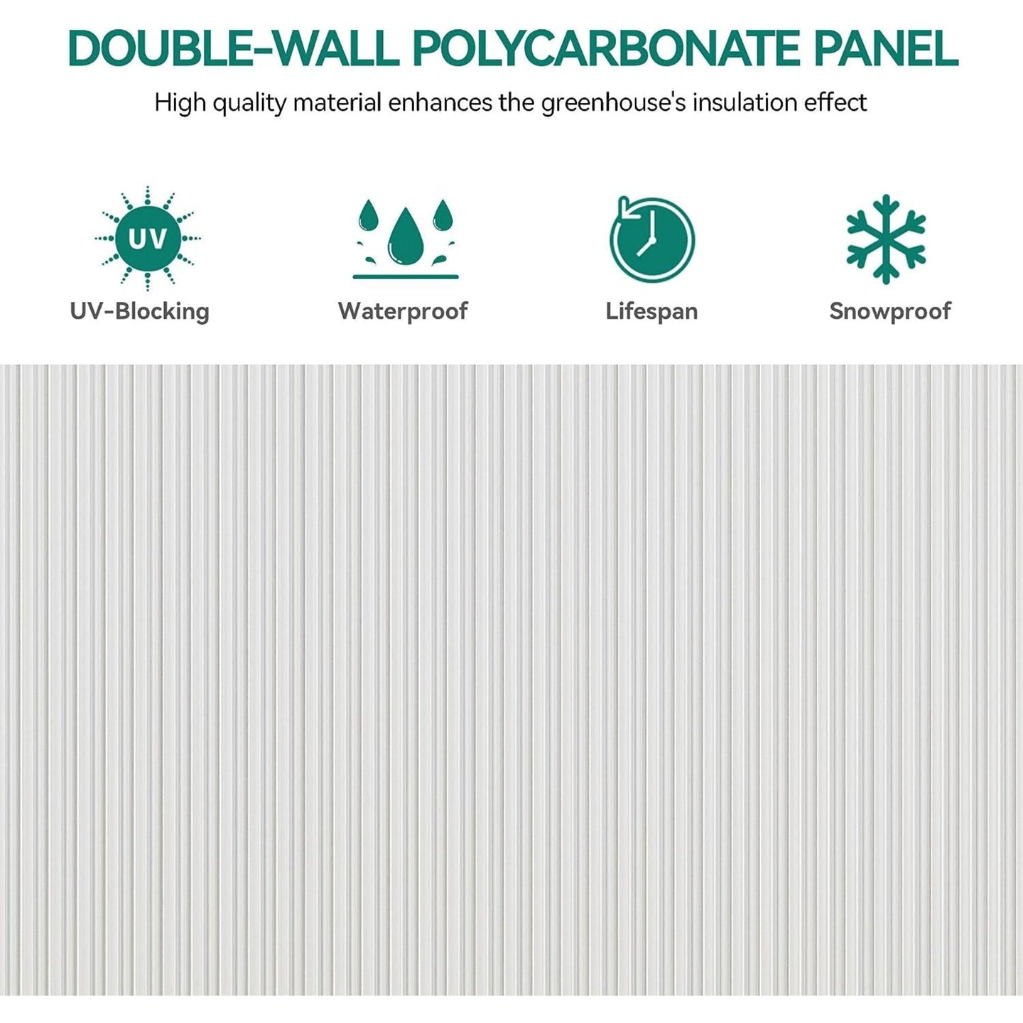 Experience the security of having your plants safely in this amazing Large Polycarbonate Aluminum Greenhouse! The durable aluminum alloy frame and reinforcing rods on the sides, paired with the double-wall polycarbonate boards, ensure superior UV protection. This sturdy greenhouse also has adjustable skylights to ensure optimal ventilation and cooling - ideal for cultivating and protecting plants year-round.