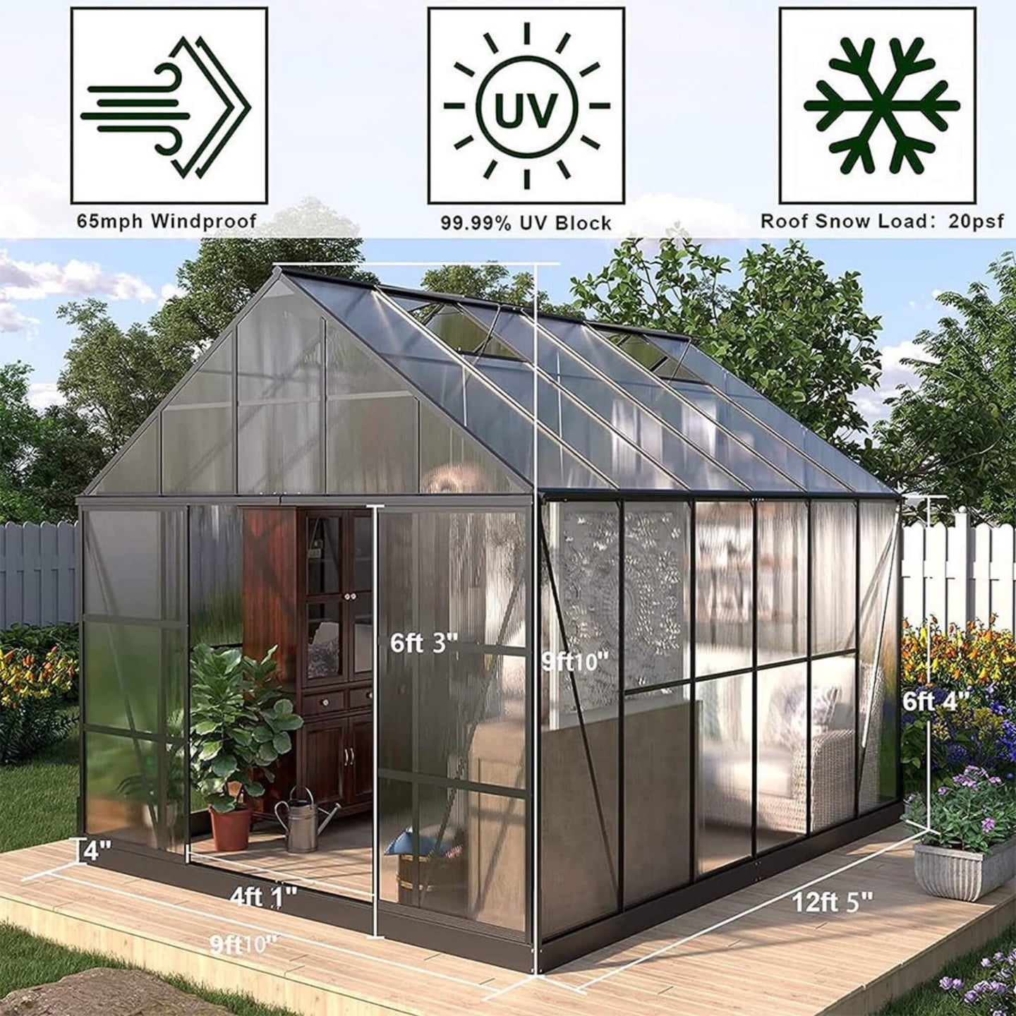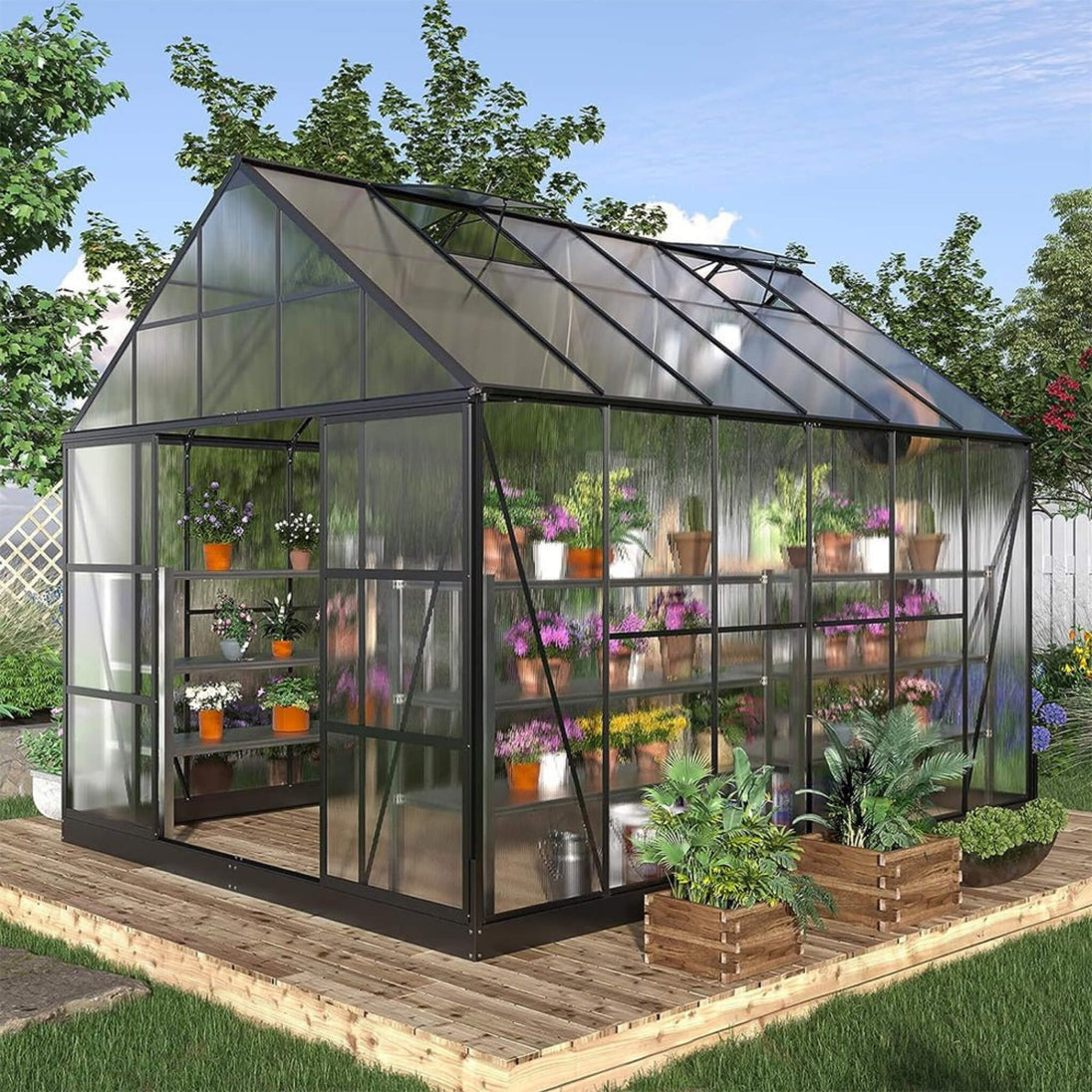This walk-in greenhouse also features a built-in gutter system for efficient water collection, both sides of which may be attached to a hose, allowing you to store rainwater for watering plants. And that's not all - it can double as a 10FT high storage shed or sunroom, offering an additional 715cu ft of space to store garden tools, a lawn mower or extra patio furniture. So what are you waiting for? Don't wait any longer – get your Heavy Duty Outdoor Walk -In Polycarbonate Patio Greenhouse With Sliding Doors Amd Vents today and start enjoying your comfortable lounging time in style!