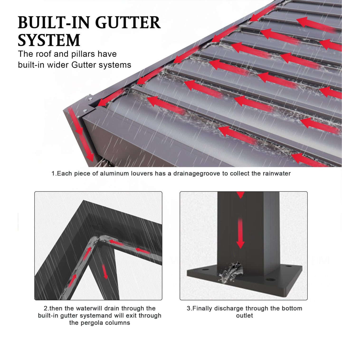 • Integrated drainage system directs rainwater through the columns and out of the base, keeping your space dry.