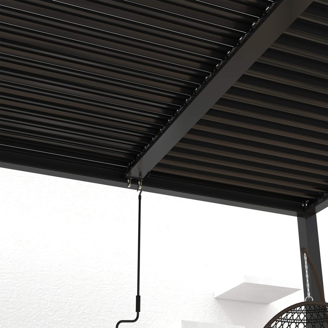 • Adjust the louvered roof with a simple crank to create the ideal ambiance, rain or shine.