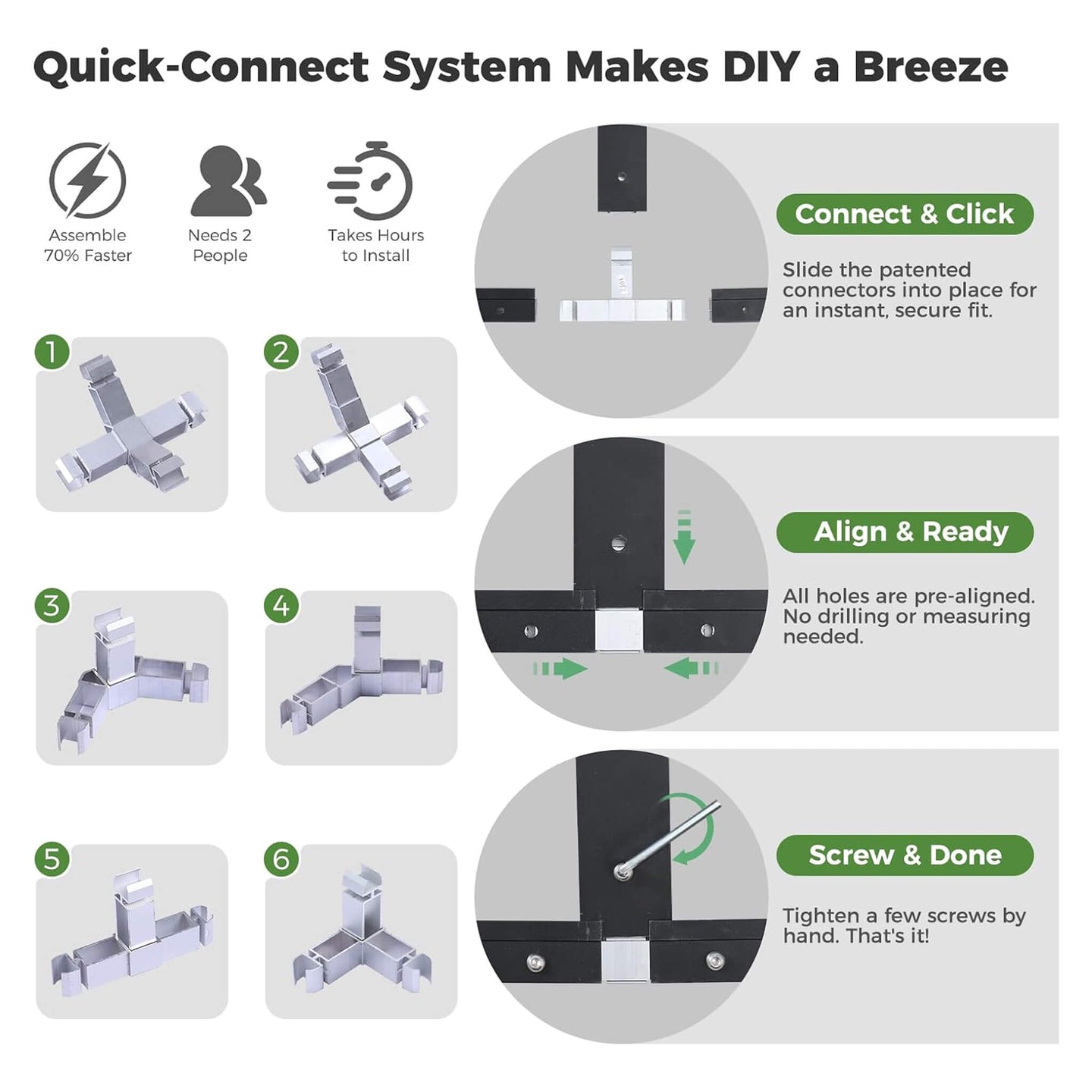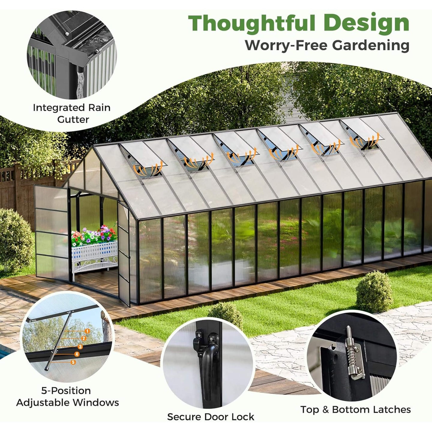 Why worry about unpredictable weather when you can rely on superior engineering? Built with a rust-resistant, thickened aluminum frame, this powerhouse is designed to withstand harsh elements and support snow loads up to 20 PSF. For maximum stability during blustery storms, the base feet are specifically designed to be buried deep into soil or concrete, anchoring your garden fortress firmly to the ground. The innovative rainwater diversion system even allows you to attach a hose and collect eco-friendly water for your thirsty plants, turning a rainy day into a resource-saving opportunity!