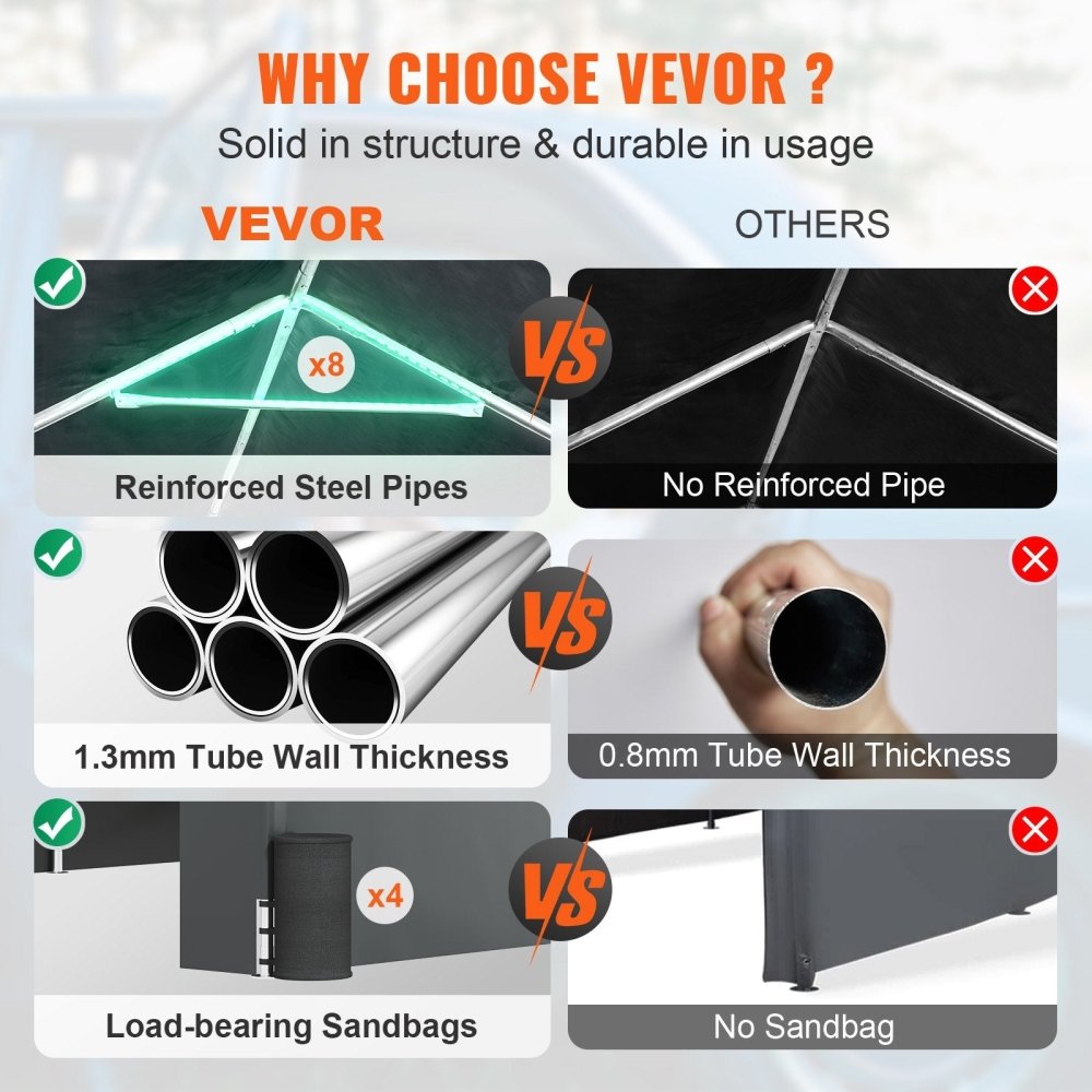 - The stable tent frame comprises 8 galvanized steel pipes and machine welding joints. Feel at ease when you start your next big camping adventure, even on windy days.