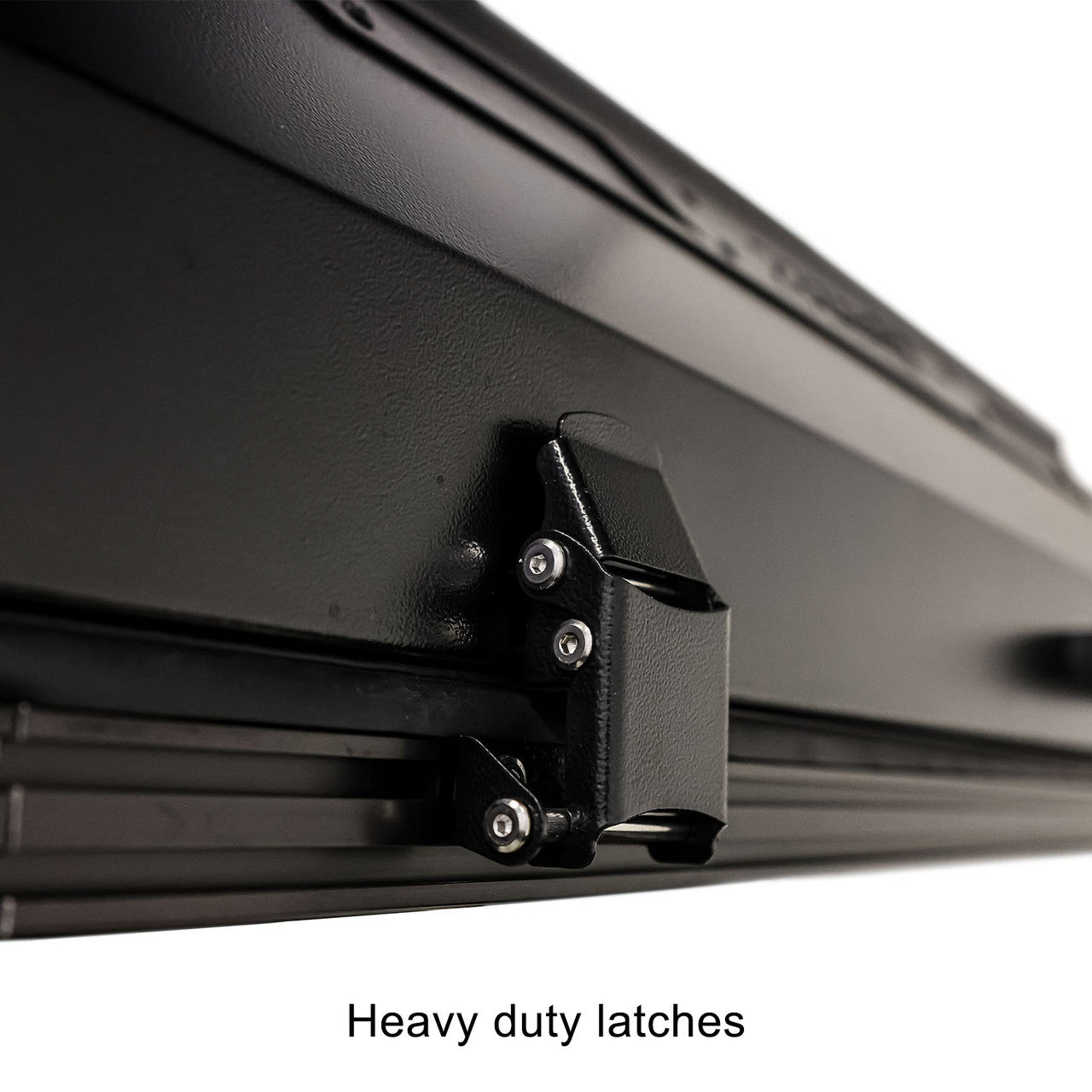Constructed from a rugged, trail-tested 14 GA fully welded aluminum shell with rounded corners, this heavy-duty rooftop tent offers exceptional strength and reliable, all-weather protection for 4-season camping. Its left-side-opening design includes a high-lift, gas-strut-assisted hinge system that enables fast, effortless setup and takedown—eliminating the hassle of front rainfly poles with an integrated hoop for instant weather protection.