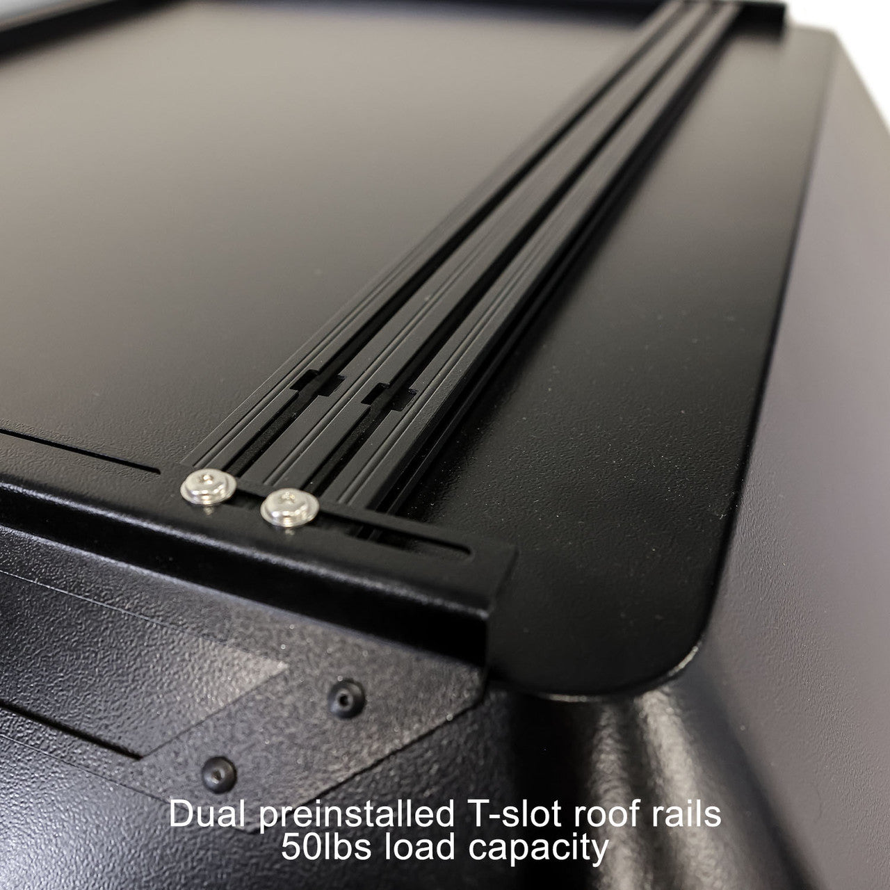 • Roof-Top Utility Rails: Dual adjustable T-slot rails (41” x 2.75”) support up to 50 lbs—ideal for solar panels, recovery equipment, or additional storage.