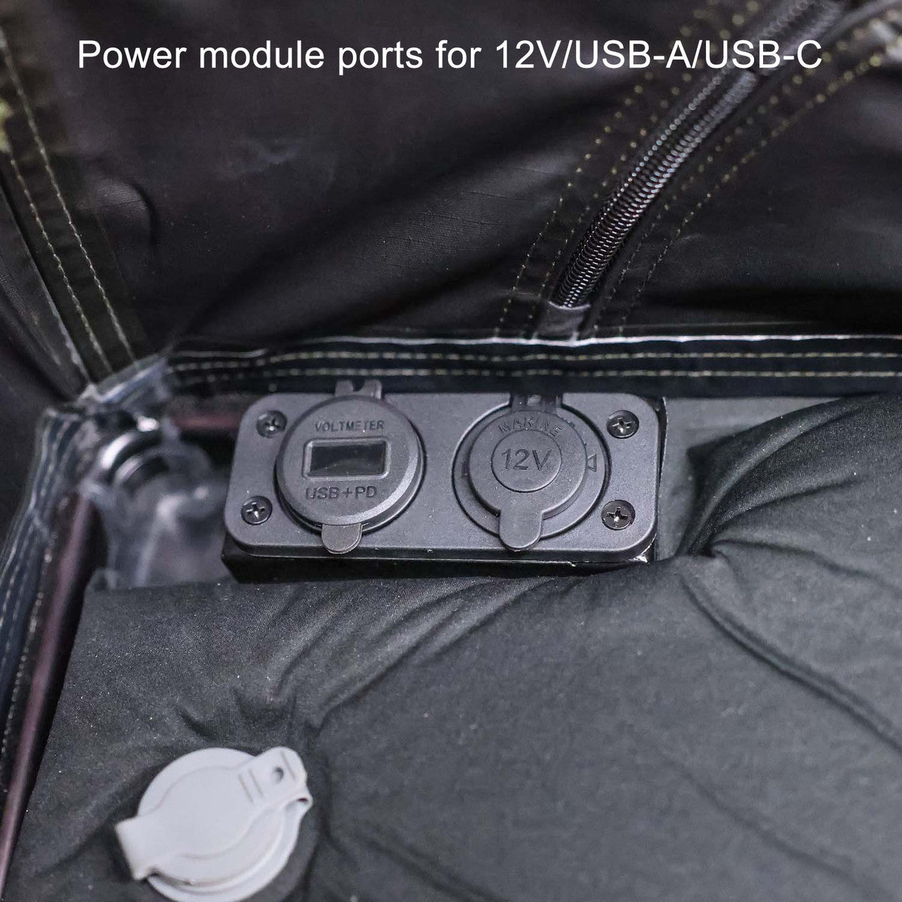 The Horizon also features a dual T-slot roof rail system that supports up to 50 lbs, perfect for mounting solar panels, recovery gear, or other off-road accessories. Power your devices easily with the built-in power module featuring 12V, USB-A, and USB-C ports wired to a preinstalled AP-50 Anderson plug (power supply not included).