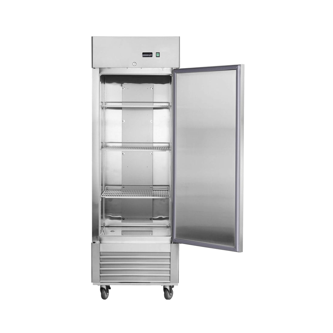 Built with heavy-duty, food-grade stainless steel inside and out, this reach-in freezer is tough enough for any commercial environment. The fingerprint-resistant finish keeps it looking sharp, while the clever door design closes automatically when opened less than 90 degrees and stays open when you need it to. With three adjustable shelves that can each hold up to 66 lbs and four heavy-duty casters for easy mobility, organizing your stock has never been simpler.