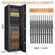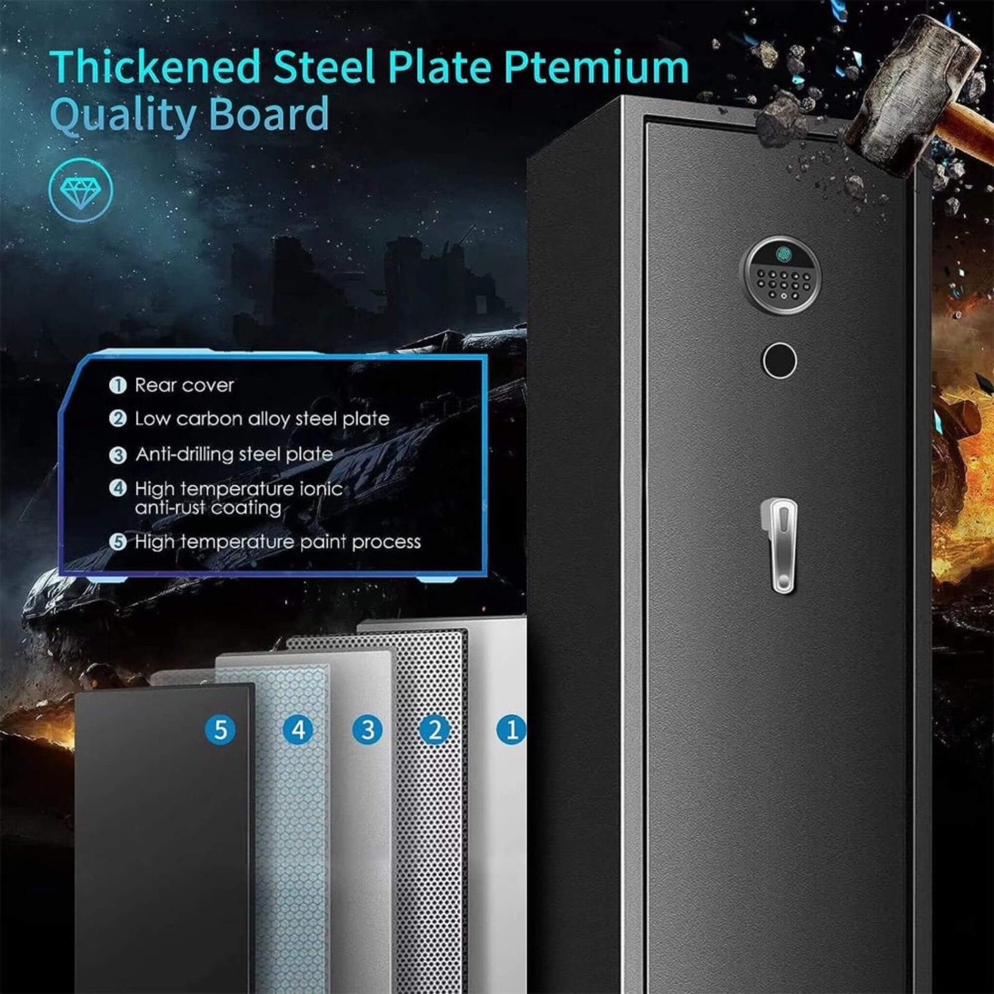 Protect your guns with this Heavy Duty Anti-Theft Fireproof Biometric Gun Rifle Pistol Safe for Home. Our rifle safe offers the highest level of security and protection for your valuable firearms and ammunition. With a sturdy 78mm ultra-thick alloy pry-resistant steel door and 5*30mm high-strength solid core lock bolts, this gun safe is designed to keep your guns safe and secure, even from unauthorized persons. Not only that, but it holds up to 11 rifles up to 60" long and very fit rifles with scopes, offering you more storage options. Plus, our safe features an adjustable shelf for additional storage and an interior carpeted floor for extra protection.