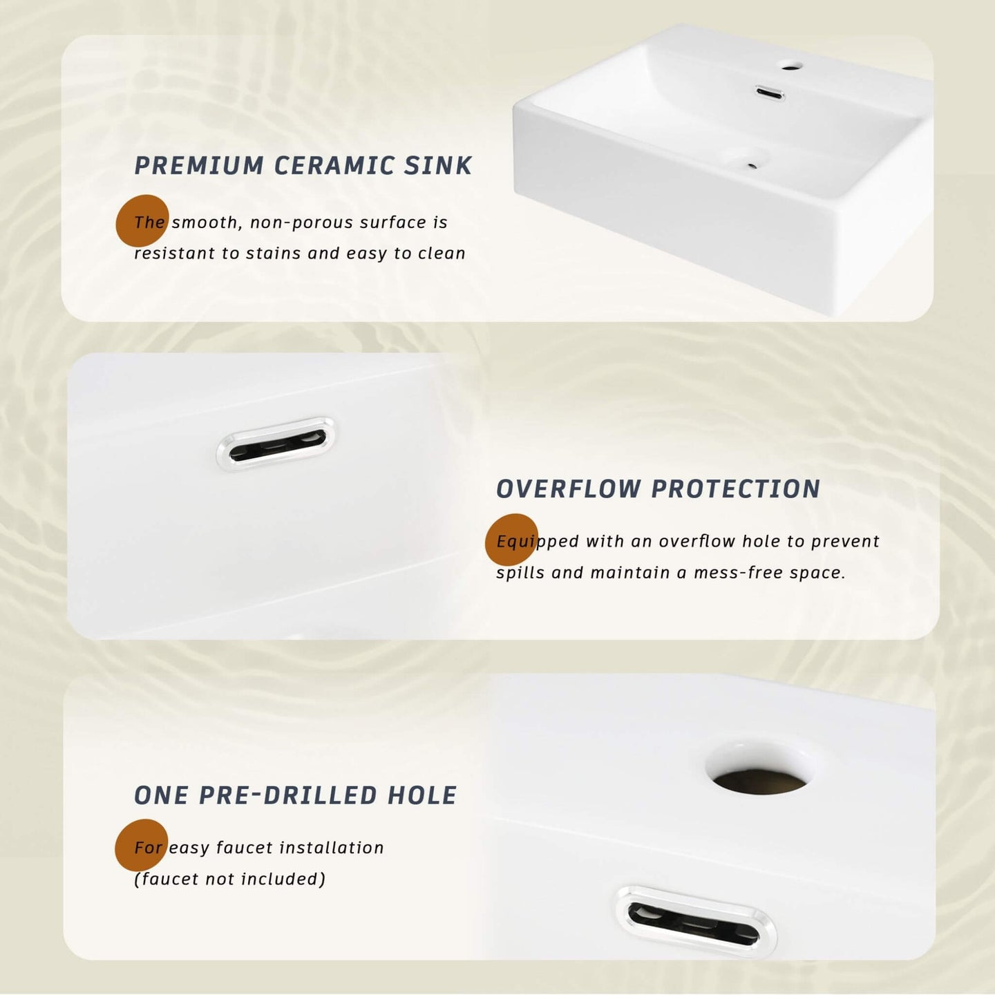 • A pre-drilled faucet hole and an integrated overflow system are designed for a straightforward setup and worry-free daily use.