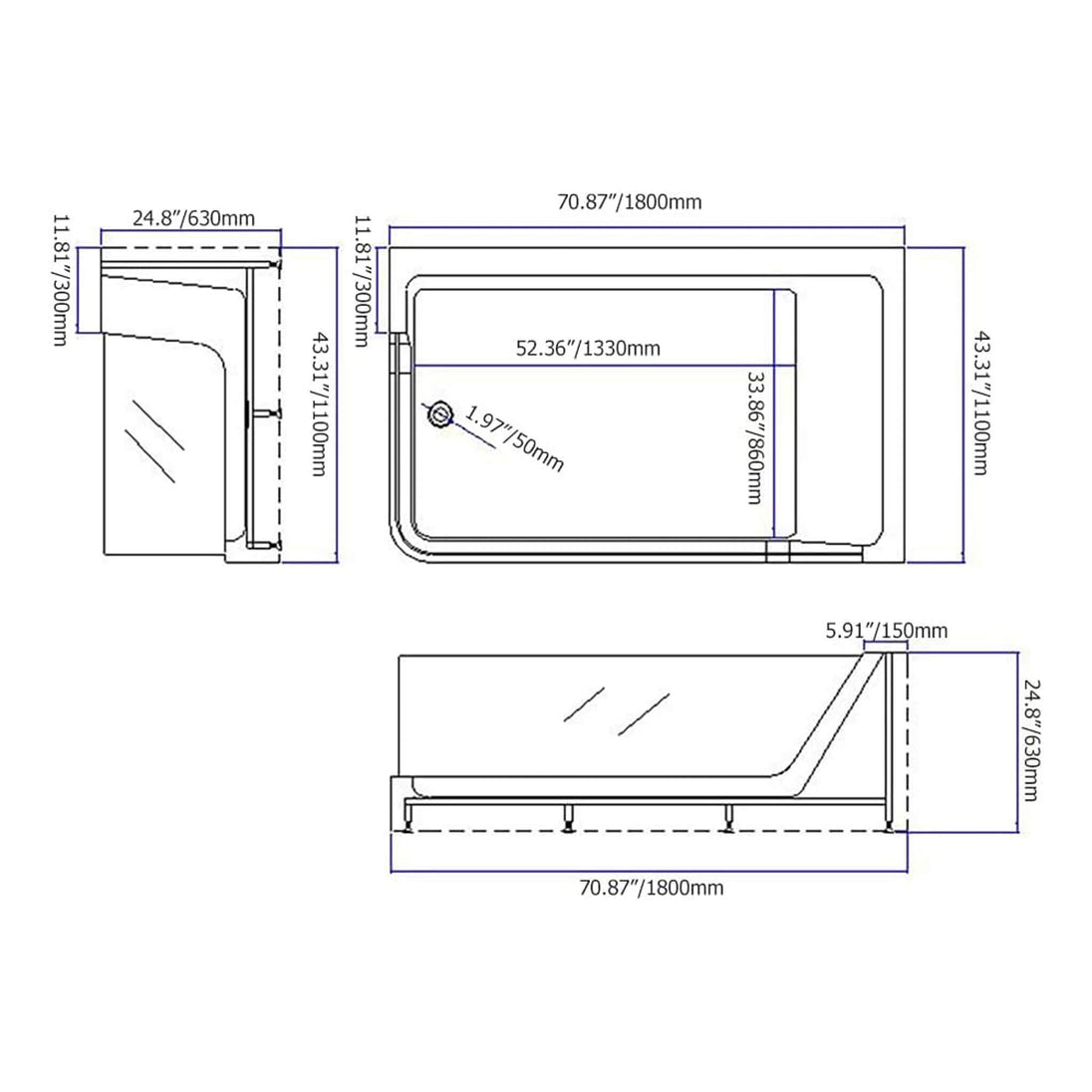 - Designed with practicality in mind, it features water level sensing, an adjustable water massage strength switch, and dimensions of 70.9"L x 43.3"W x 24.8"H, with a centered drain placement and an efficient back or one-side wall installation design.