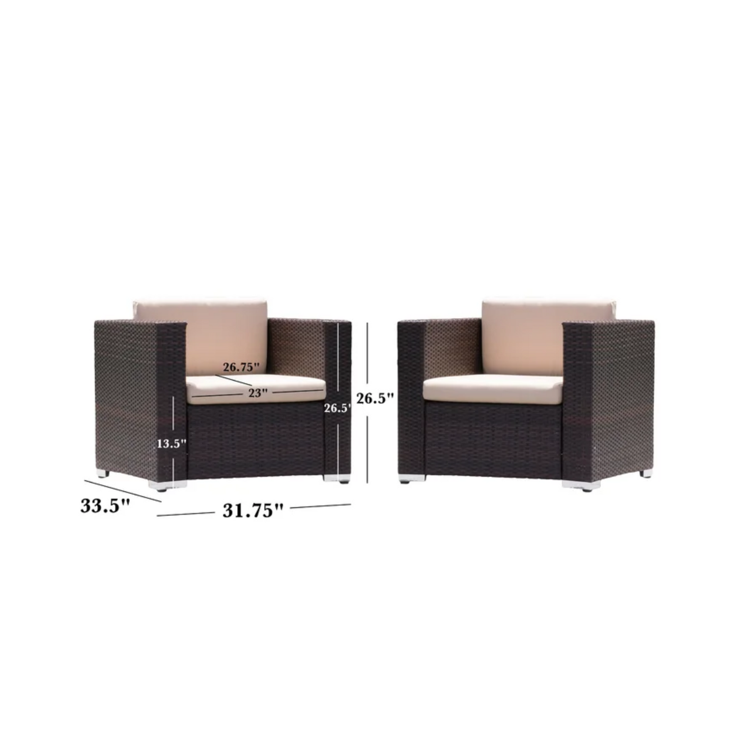 • Each chair is crafted with water-resistant tan cushions that offer lasting comfort and refined style, making it ideal for all-season outdoor lounging.