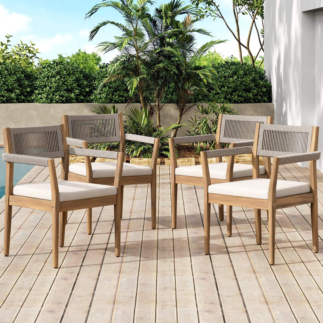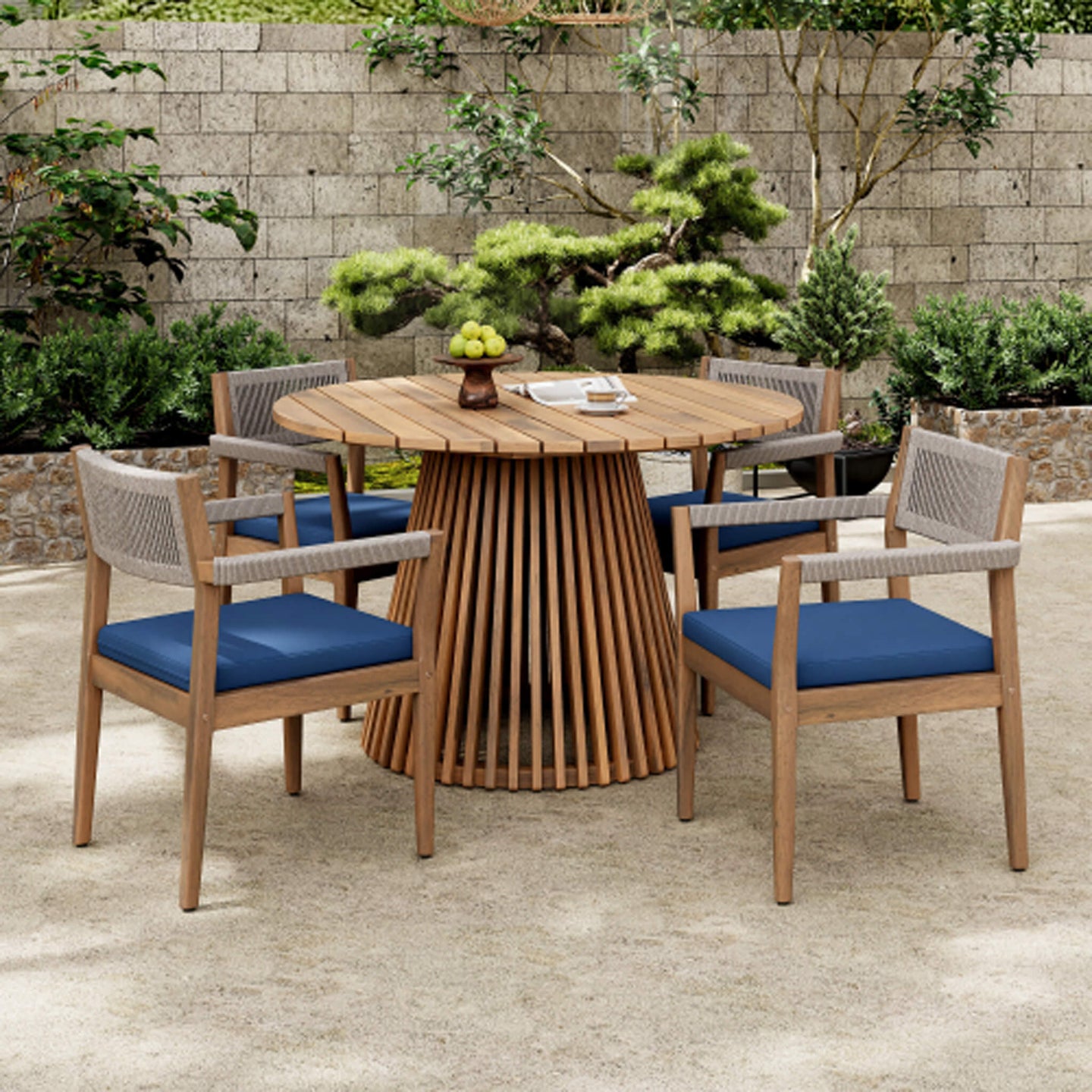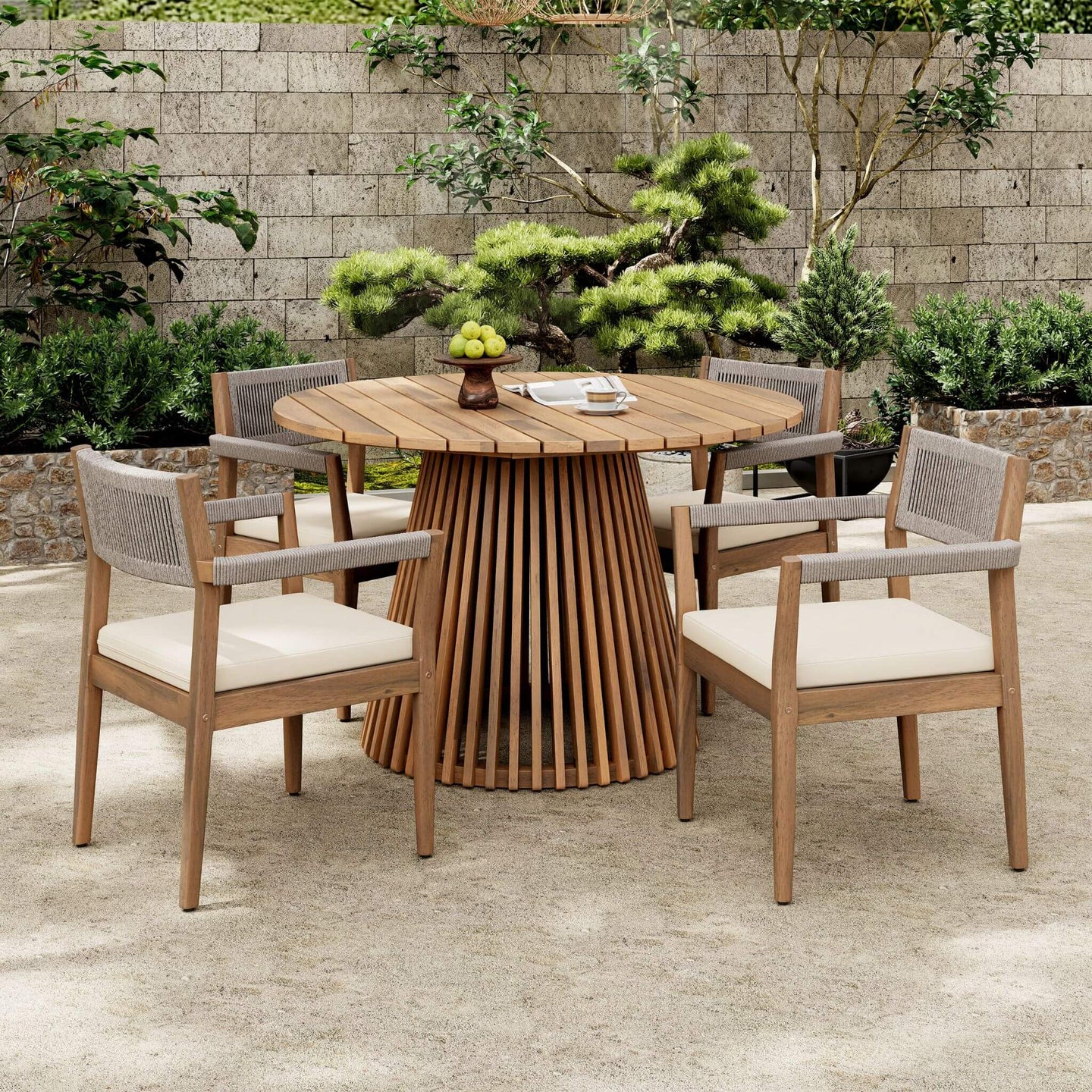 Crafted with acacia wood featuring a Light Teak finish, this set gracefully endures the challenges of weather and time. The robust round dining table and four inviting chairs, with their beige rope weave and plush, weather-resistant cushions, deliver both aesthetic appeal and unmatched comfort. Whether you're enjoying a morning cup of coffee or hosting a summer evening soiree, the set’s blend of versatility and durability ensures long-lasting enjoyment.