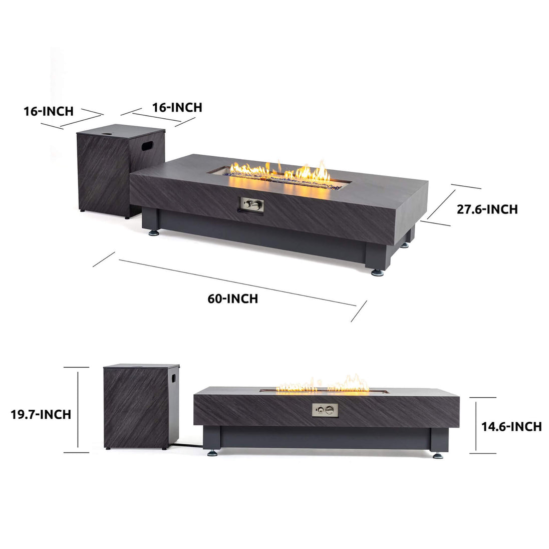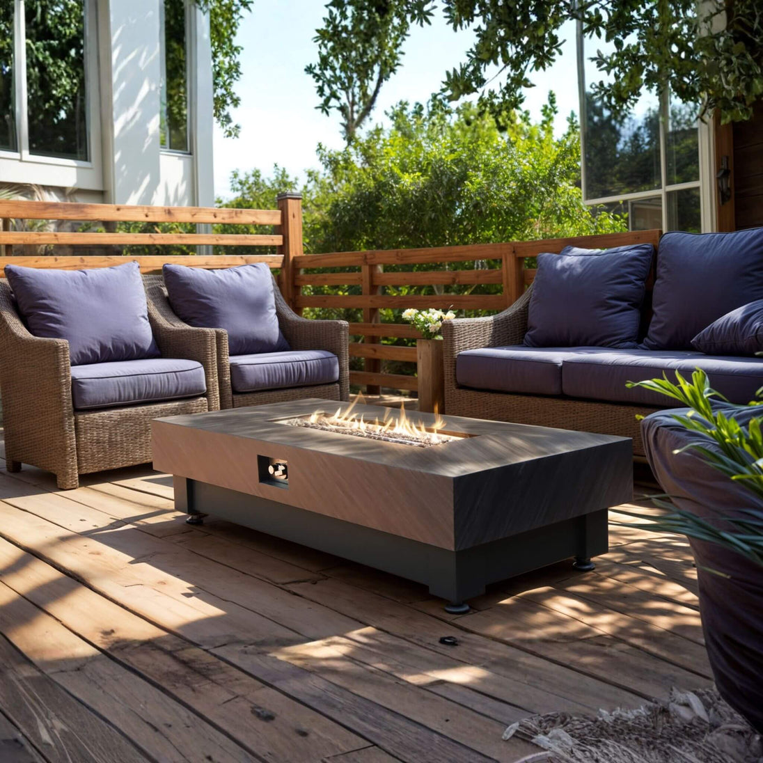 This stunning 60-inch rectangular fire pit table elevates your outdoor entertaining with sophisticated style and unmatched functionality. The sleek contemporary design, available in elegant stone or rich walnut wood finishes, creates an inviting focal point that seamlessly blends with any patio or backyard aesthetic. Built for both beauty and performance, this premium fire table accommodates 5-6 people comfortably while providing a generous surface for drinks and appetizers during memorable gatherings.