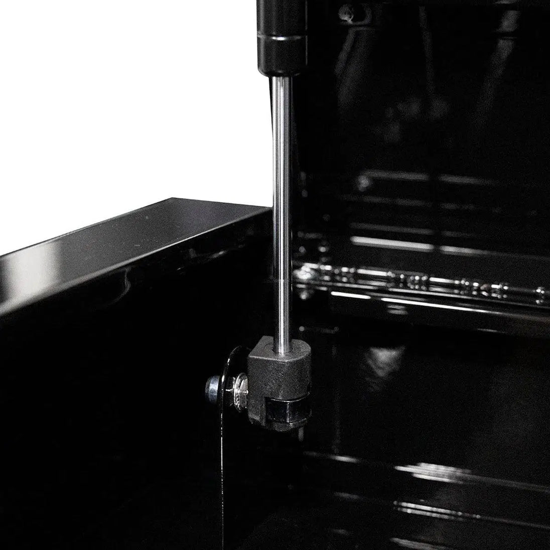 - Features a drop front lid with full-length piano hinge, powered by two heavy-duty gas struts for smooth opening.