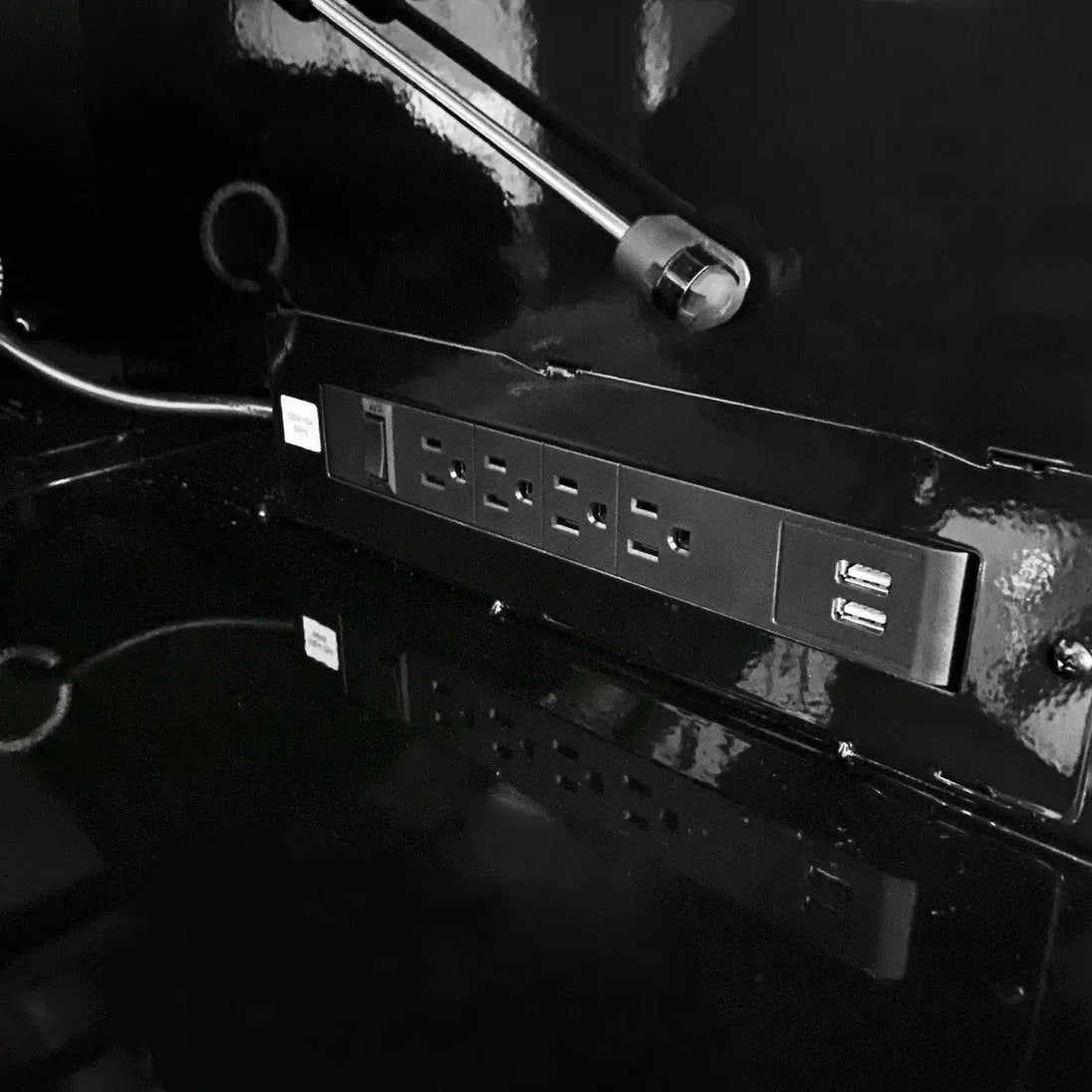 - Builtin 110V power strip and USB connectors for convenient charging.