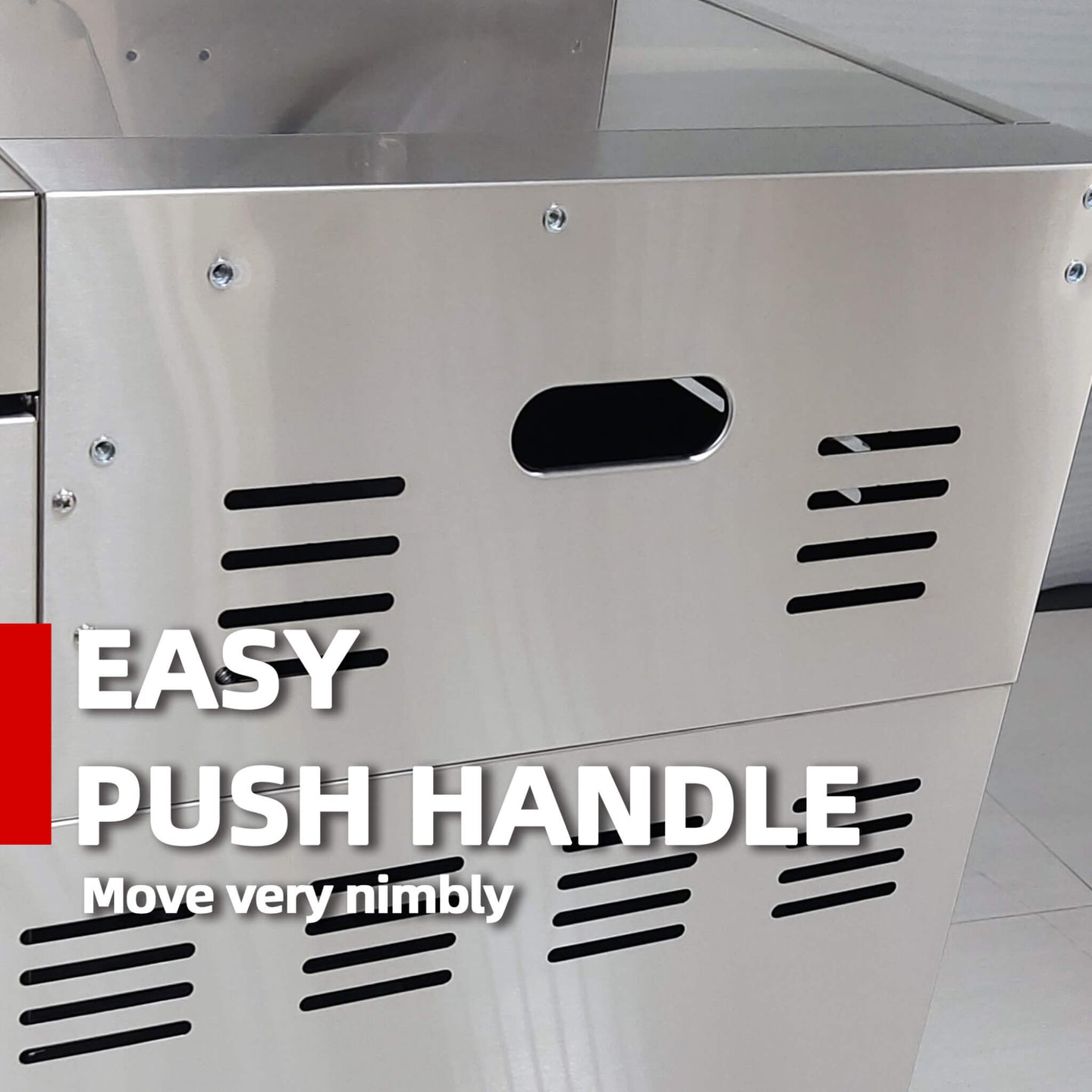 • This island arrives almost fully assembled with features designed for ease of use, including electronic ignition for quick startups and a full front pull-out grease tray for simple cleaning. Ample storage drawers and cabinets keep your tools organized, while gliding caster wheels allow you to effortlessly move and secure your kitchen island anywhere you please.