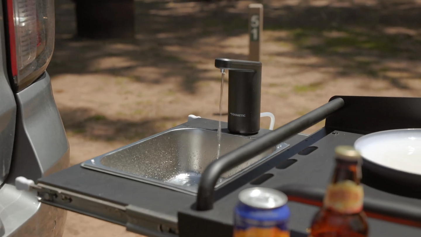 The Cook Station is the ultimate hitch mounted dual-purpose cargo and cooking solution. Built on the Ledge XL Cargo Platform, the Cook Station boasts a 38 x 24” storage and food prep surface and a slide-out sink basin and single burner stove. The Cook Station utilizes our exclusive swing arm for easy access to the back of the vehicle while the stout removable side rails and integrated mounting points allow you to store your cooler, jerry cans, firewood and more outside your vehicle. The sink basin can be used with gravity water system or can be paired with a Dometic Go rechargeable electric faucet.