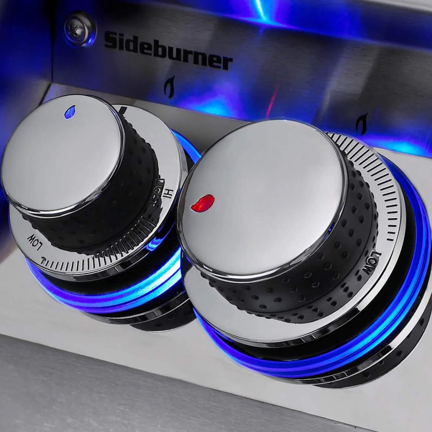 - Grill day or night using the internal halogen lights and backlit LED control knobs that glow softly in blue, turning red as the heat intensifies.