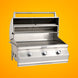 - Durable and luxurious, this grill is constructed from 304-grade stainless steel with a sleek satin finish. Ergonomically designed comfort-touch knobs and an angled analog thermometer make it easy to monitor and control your grill. The integrated wind guard ensures a steady flame, even on windy days.