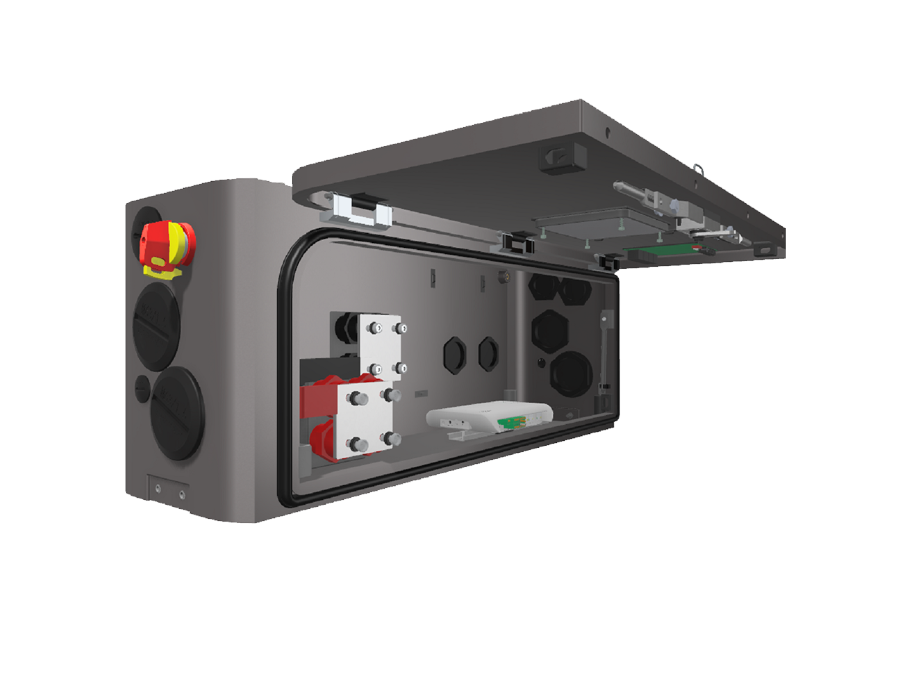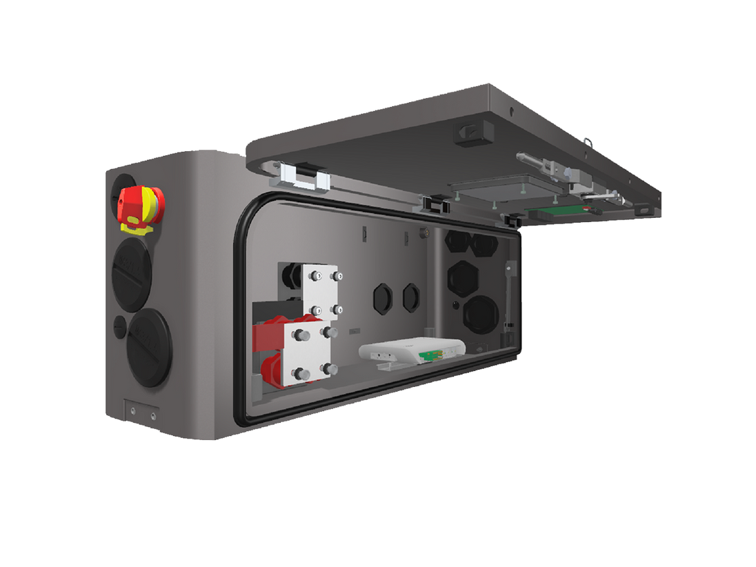 - Equipped with the eWay wireway featuring busbars, conduit ports, and emergency shutoff.