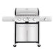 This robust grill offers unbeatable versatility – it has 4 stainless steel burners and comes with a side burner for precise heat control, along with an instant battery-operated electronic ignition system. Enjoy cooking your favorite recipes with over 40,000 BTUs of total heat that will evenly distribute across the 542 sq.” of cooking area, perfect for small or large gatherings alike. The efficient double-layer lid prevents any heat loss while ensuring food keeps warmer for longer periods of time. Plus, you can easily check the temperature anytime with the built-in thermometer!