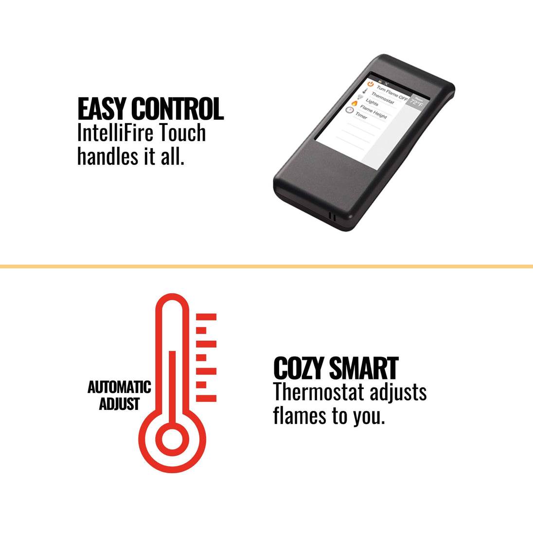 - With the IntelliFire Touch system, you can manage your fireplace seamlessly using the IntelliFire App, your smart speaker, a sleek touchscreen remote, or even a wireless wall switch. Enjoy the perfect ambiance with just a touch.