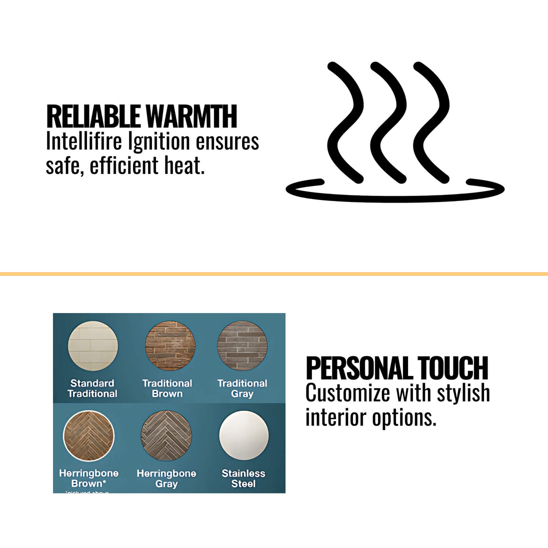 - Tailor the look of your fireplace with interior options that suit your taste. Choose from sleek stainless steel or classic brick panels in traditional or herringbone patterns to create the perfect ambiance for your outdoor space.