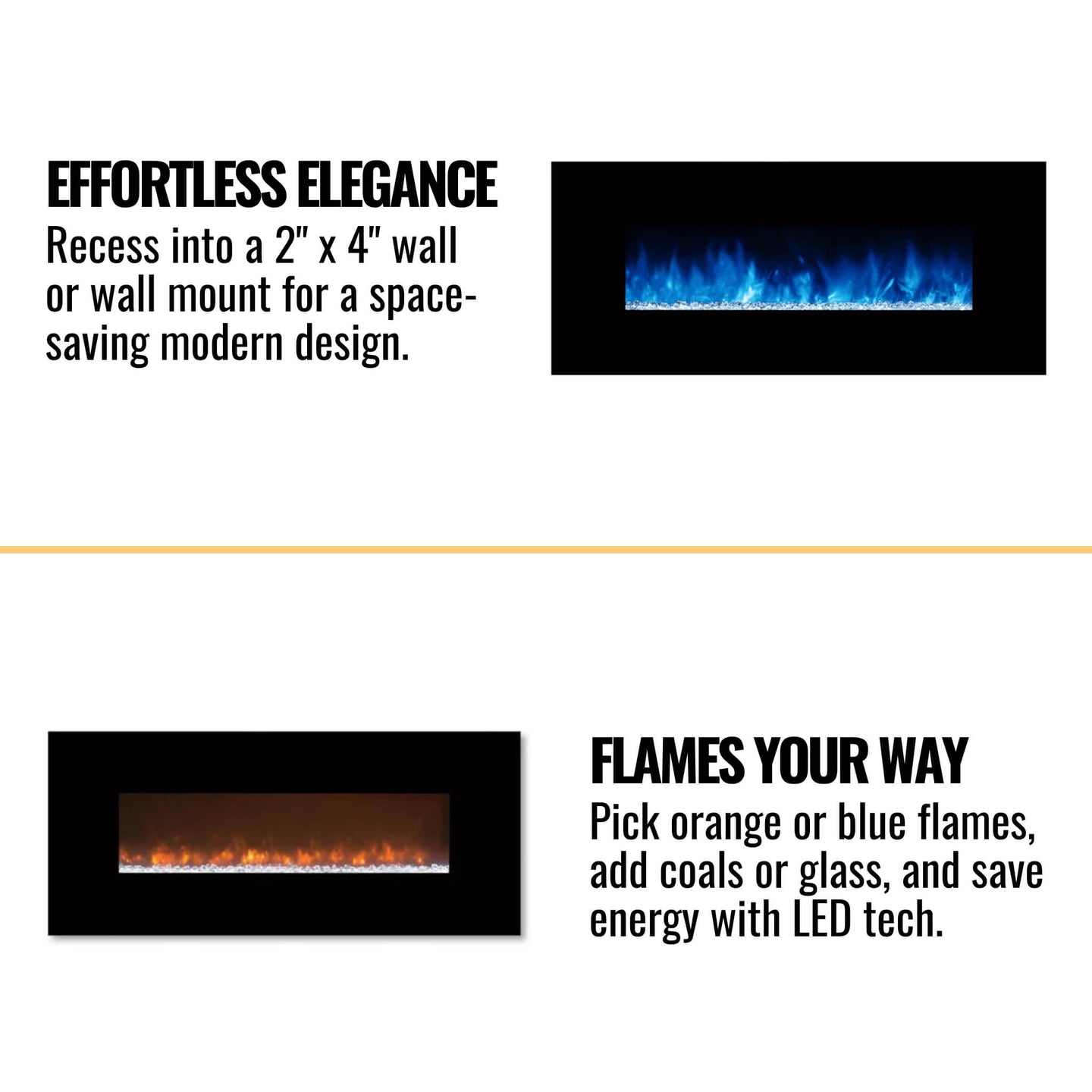 - Seamlessly integrate the fireplace into your living space with the option for recessed installation into a 2" x 4" wall or simple wall mounting, ensuring a modern and low-profile aesthetic.