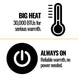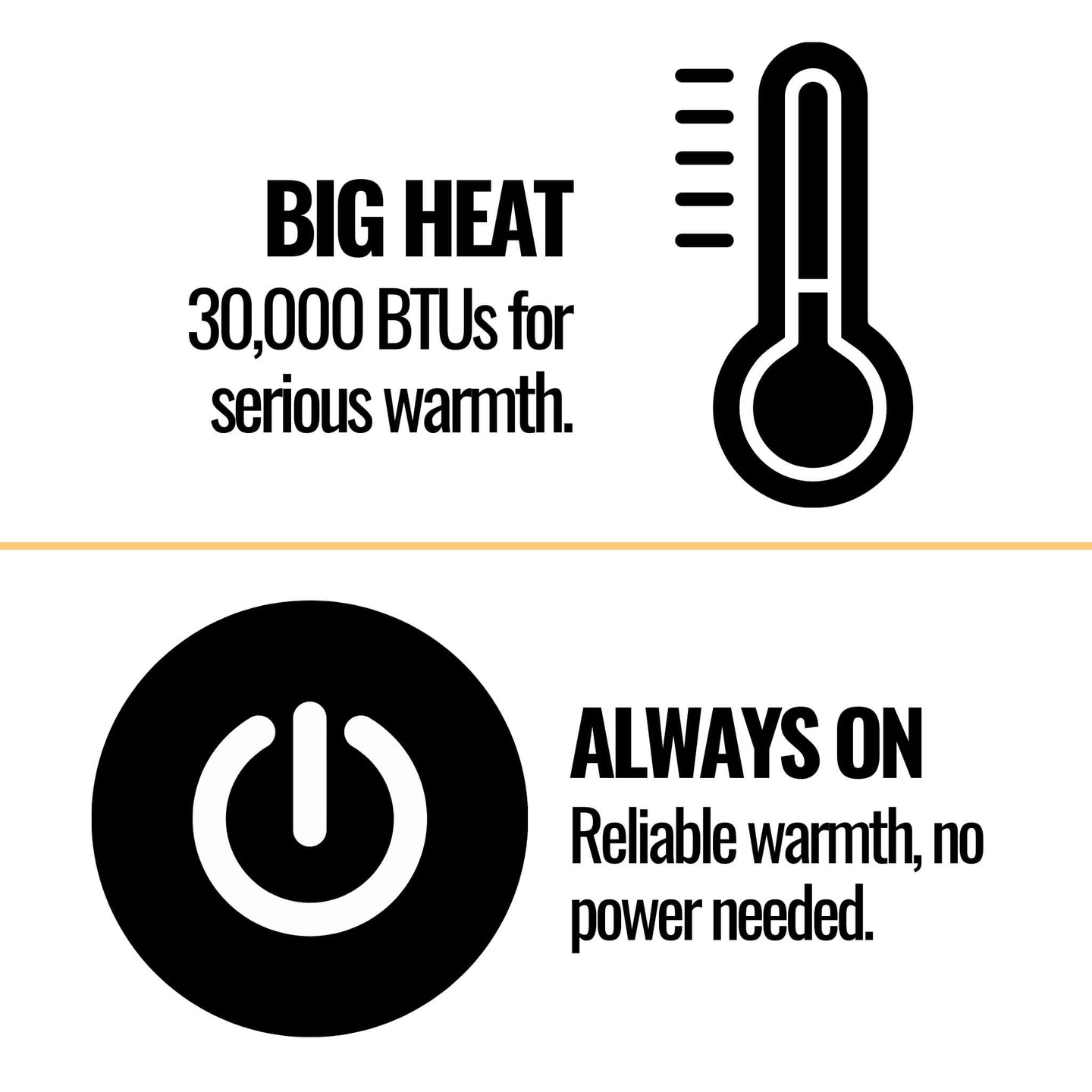 • Experience robust warmth with up to 30,000 BTUs. This high output ensures that even larger spaces are heated effectively. Enjoy a comfortable environment no matter how chilly it gets outside.