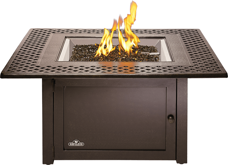Experience the comfort and warmth of a fire pit with the Kensington Square Patioflame® Table, designed for use with natural gas or propane. The stunning topaz glass ember bed enhances the flame's ambiance and allows for customization with colored glass options, making it perfect for cozy gatherings or lively outdoor events.