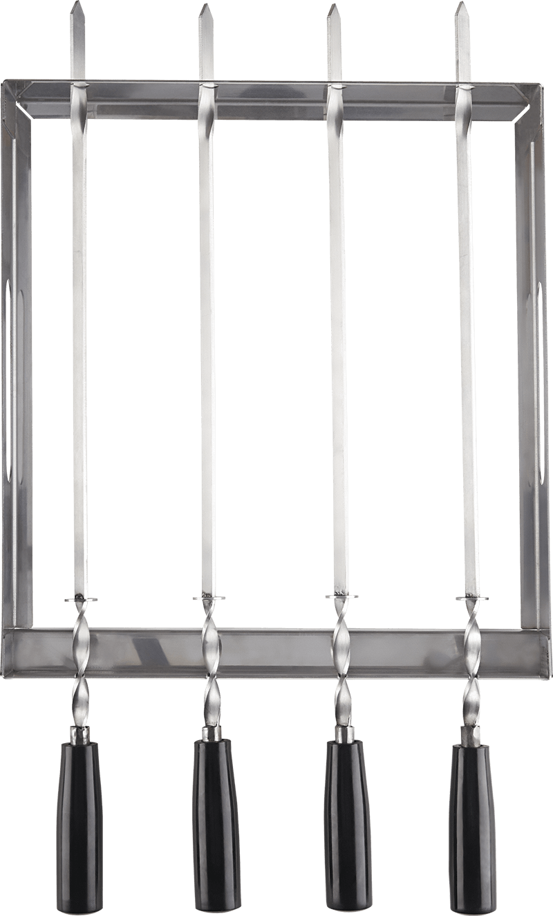 • Includes: Four stainless steel skewers with heat-resistant handles