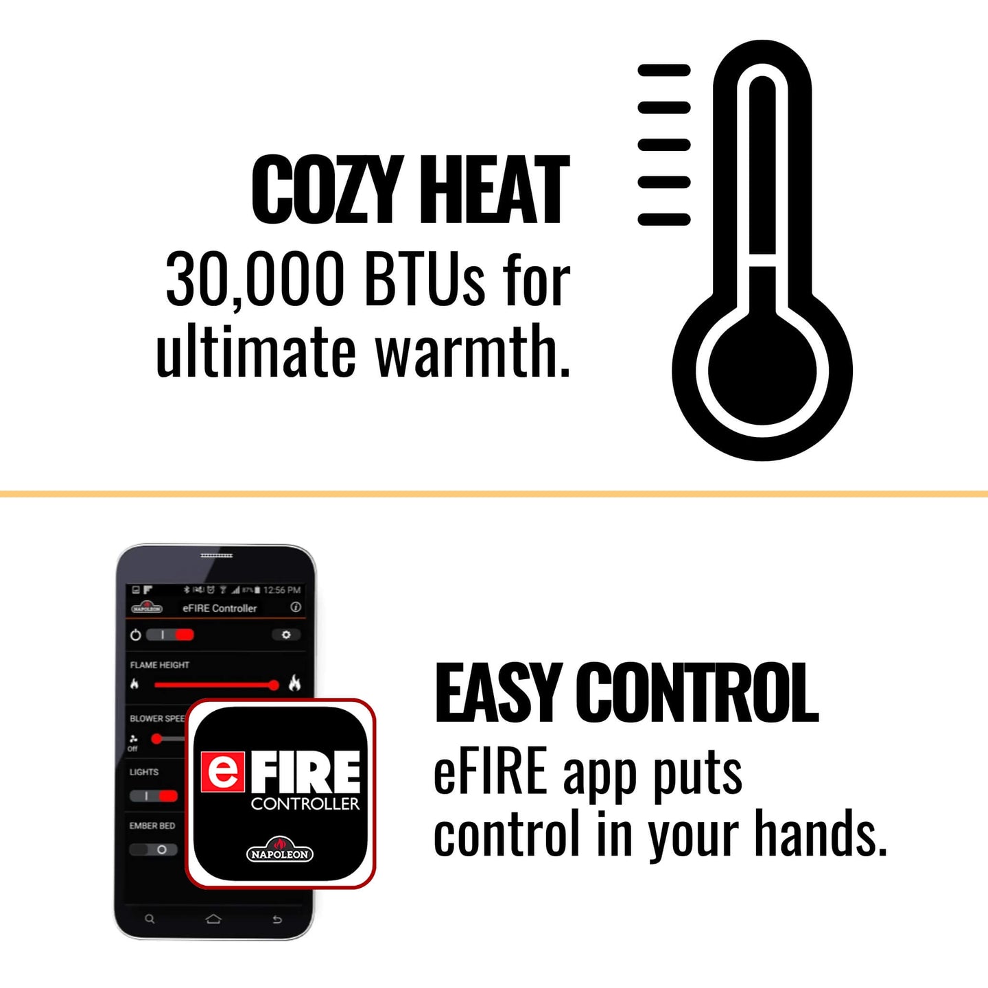 • Manage your fireplace conveniently with the eFIRE Bluetooth app. Adjust temperature, lighting, and settings, all from your smartphone.