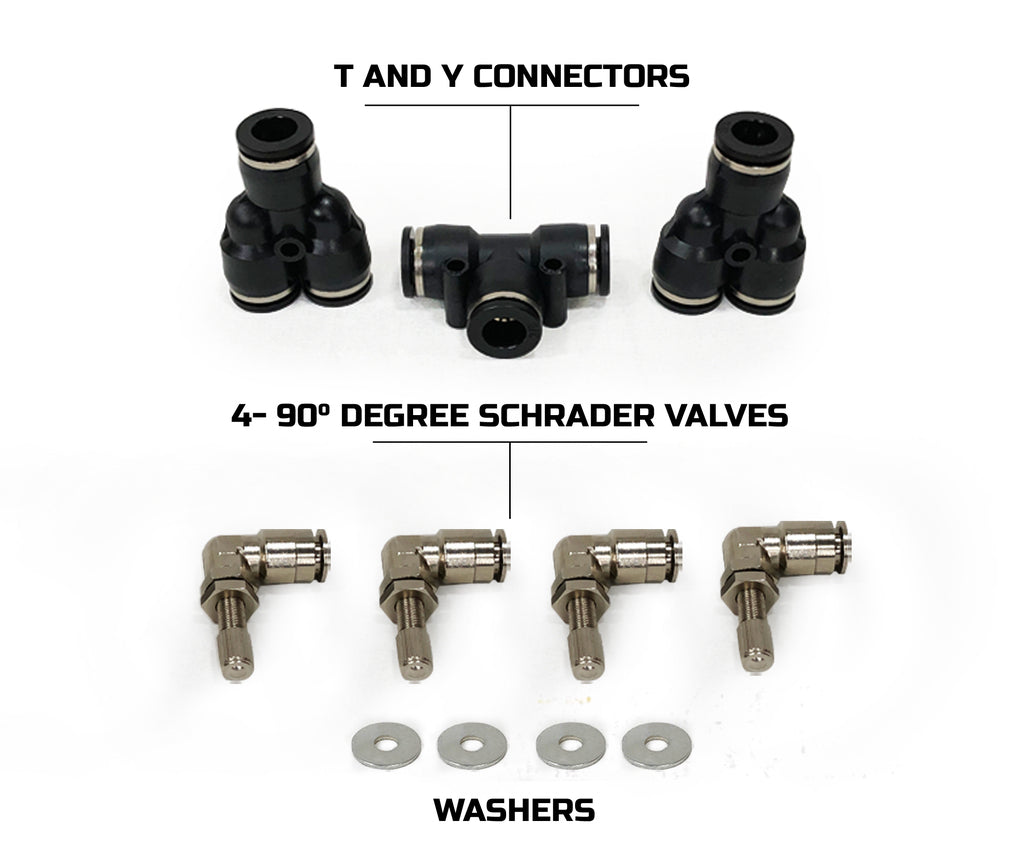 - DOT-approved 3/8" air line throughout the system and 90-degree Schrader valves to maintain airflow to each tire.