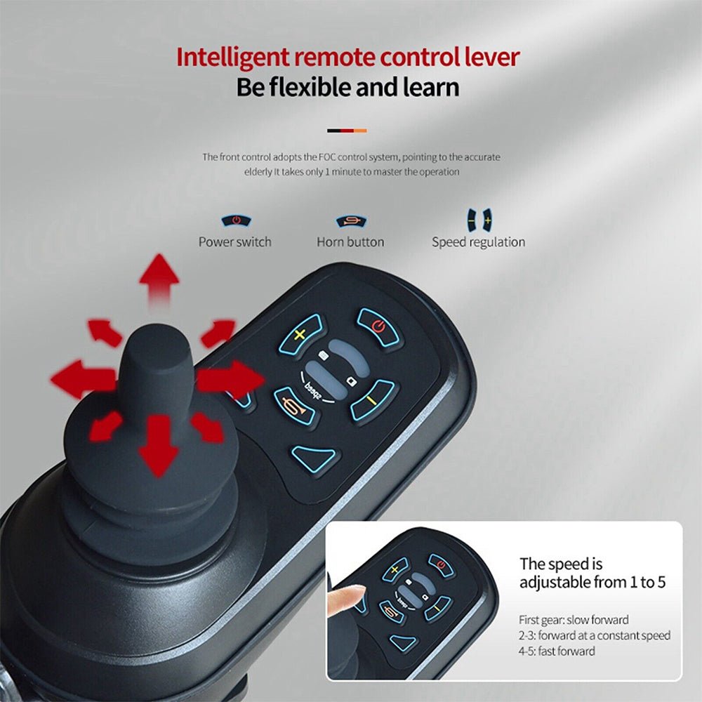 Equipped with a control panel, the portable power wheelchair doesn't require much effort to keep moving. By simply moving the joystick, you'll be able to control the movement of the electric lightweight wheelchair without a hassle.