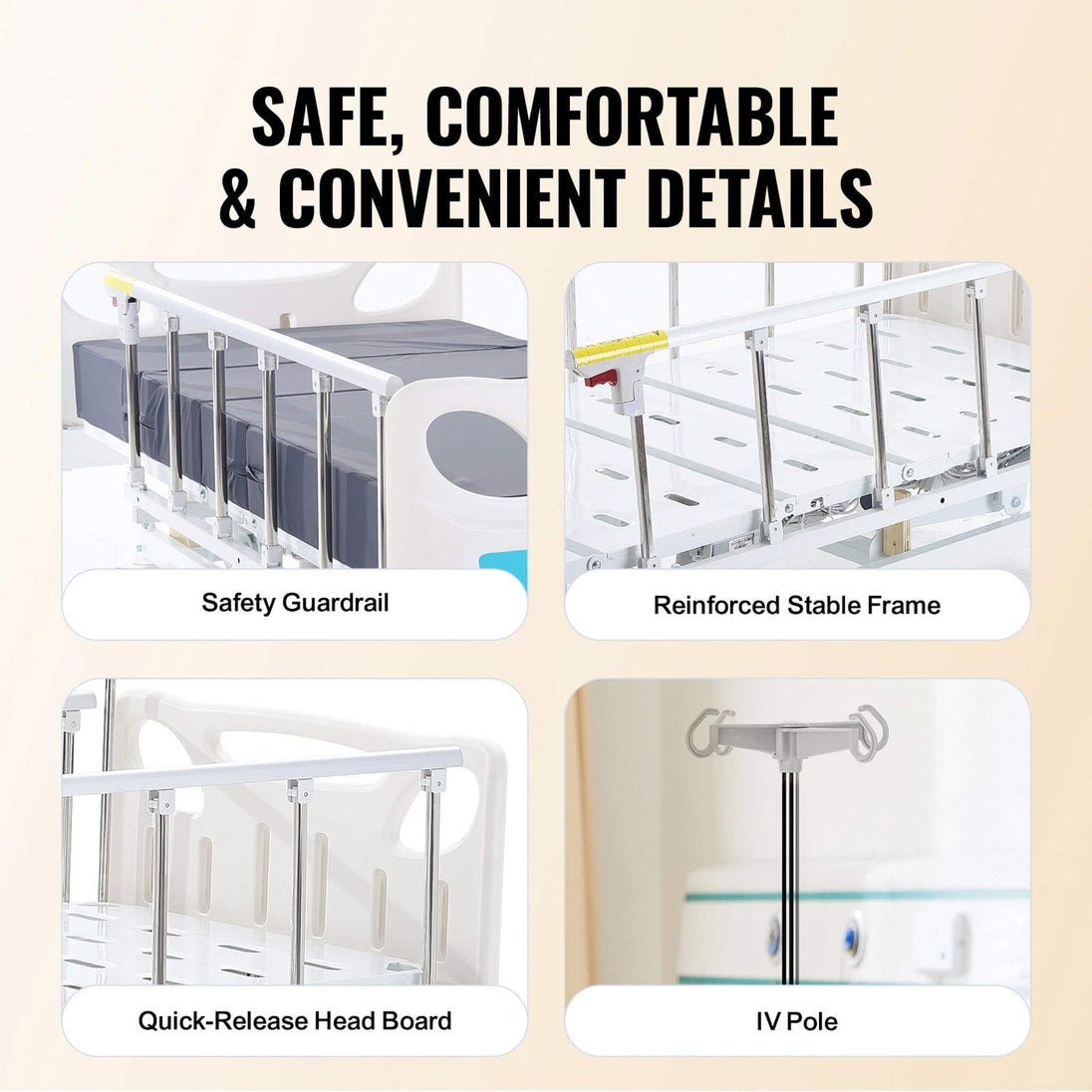 Superior convenience meets exceptional care with features like a 15cm memory foam mattress that is as supportive as it is durable, offering enhanced comfort while preventing liquid penetration for hygiene. The included IV pole ensures that you have essential medical care tools at your fingertips. Whether on carpet or hardwood, the 5-inch lockable casters provide smooth, stable mobility, effortlessly gliding across surfaces, while a robust 440 lb load capacity ensures reliable support for every need.