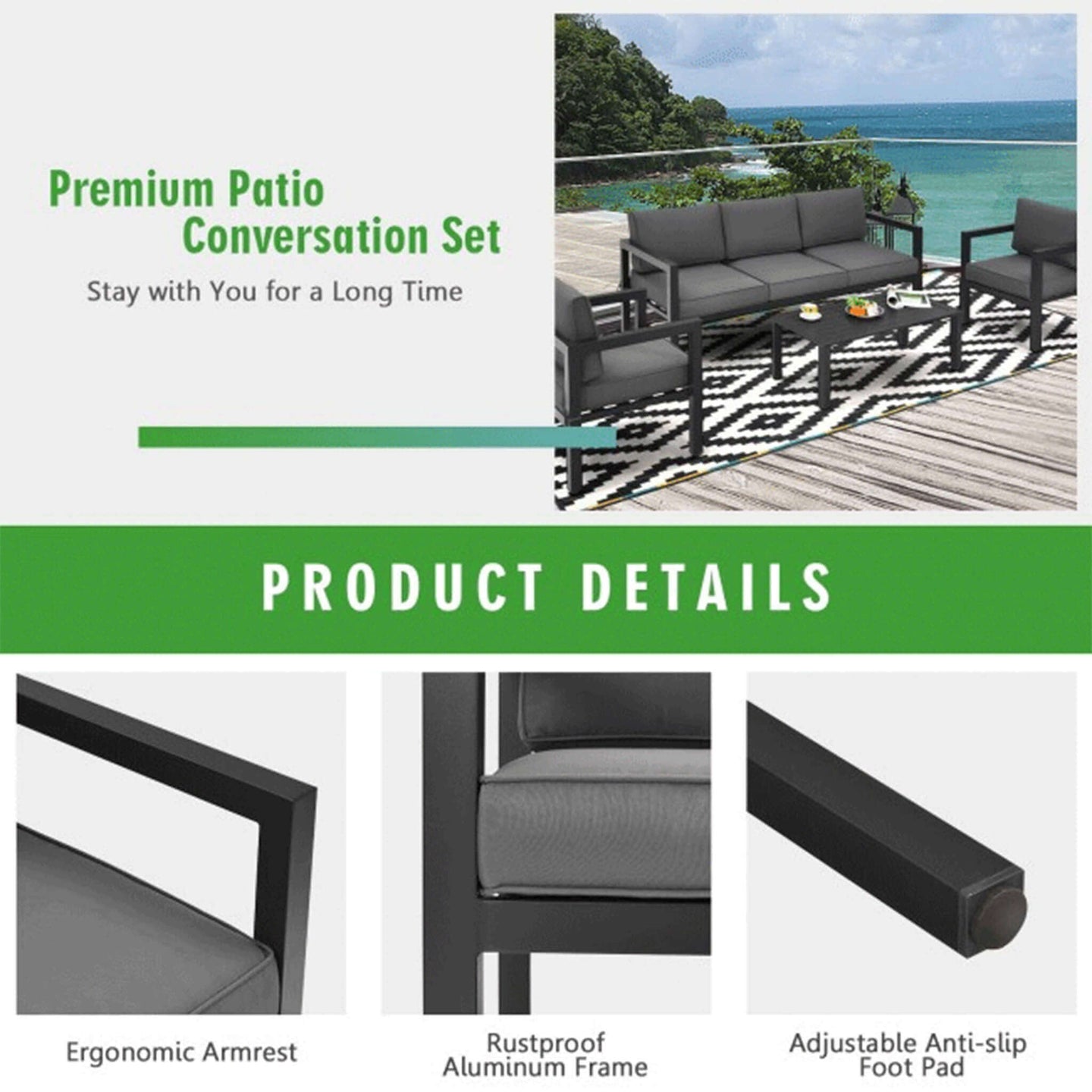 Are you looking for a modern-looking furniture set to spice up your patio? Our Premium Outdoor Furniture Set is the perfect additional to any backyard and is great for inviting your friends and family to seat together and enjoy the beautiful summer days.