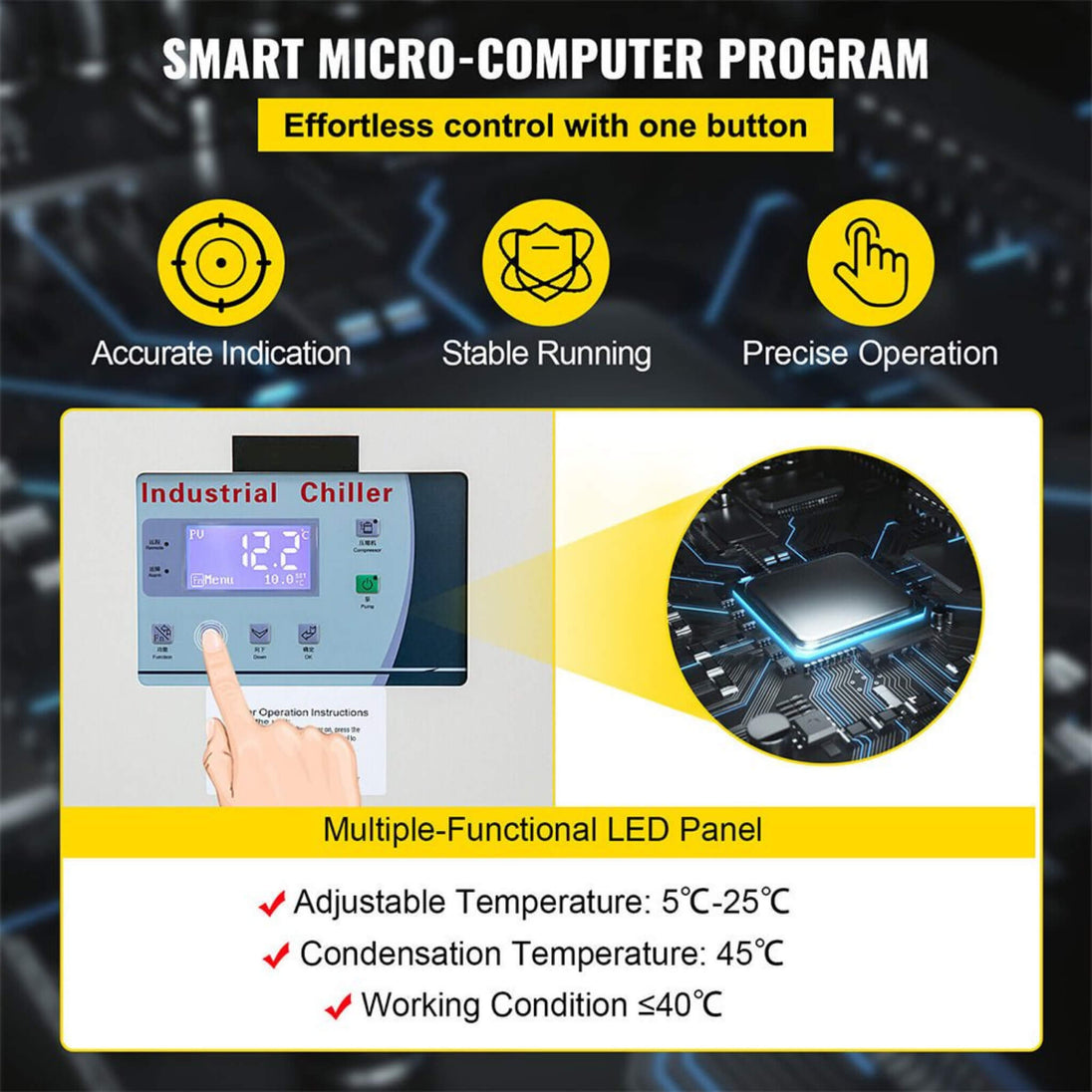 Keep your temperature-sensitive system running smoothly and efficiently with this Air-Cooled Industrial Chiller. With a digital LCD display and a water tank, you can easily monitor the cooling process while keeping your space cool and comfortable to stay in.