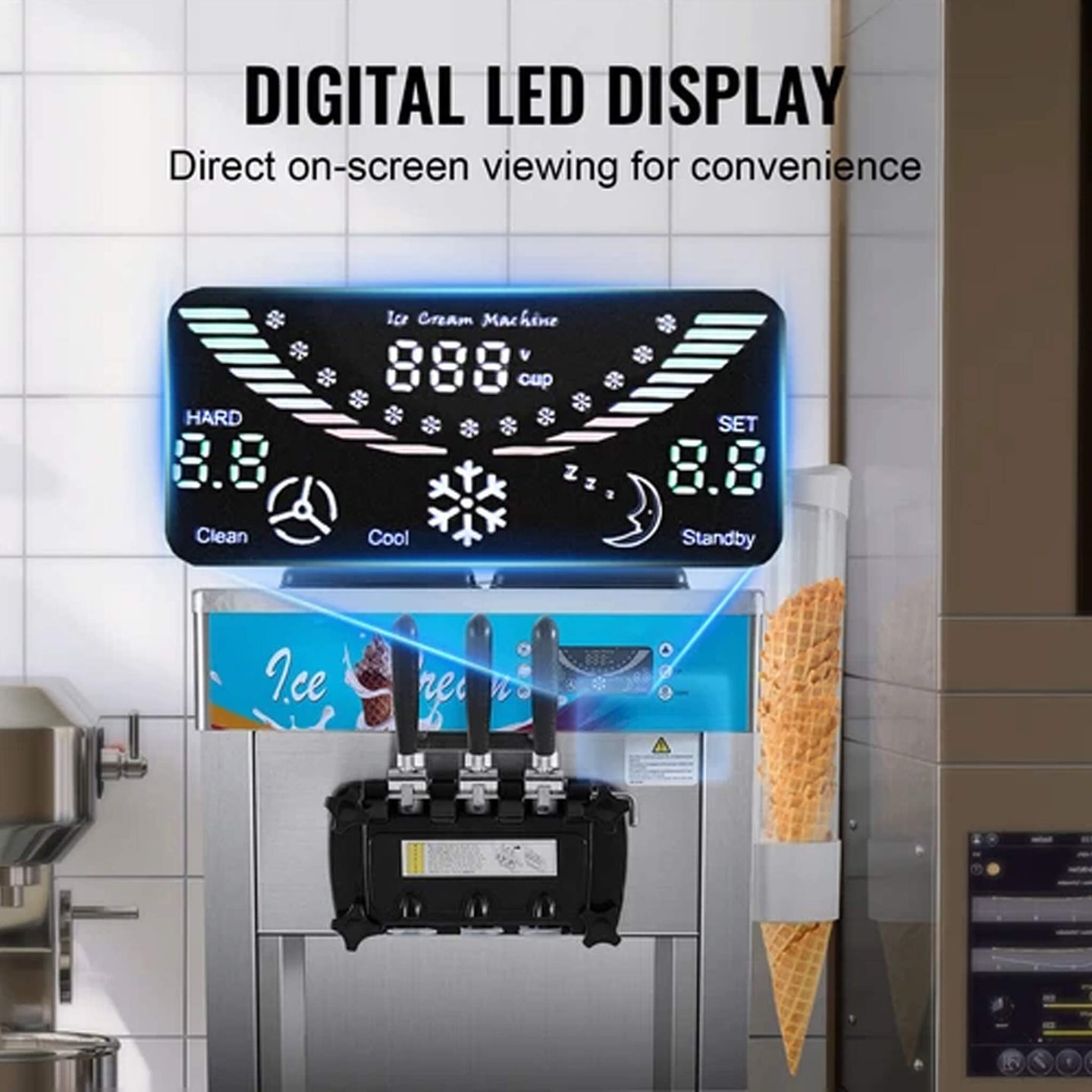 - Simplify your operations with an intuitive LED panel that allows you to adjust ice cream hardness, set timers, and activate auto-cleaning with just one touch. Perfect for reducing training time and streamlining daily maintenance.