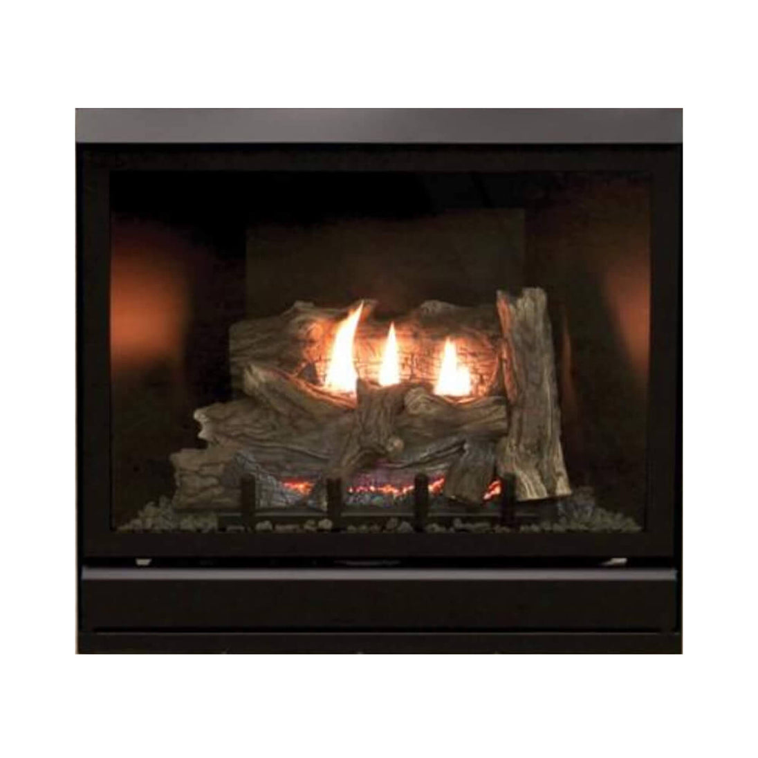 - The heat-resistant tempered glass window offers a stunning, unobstructed view of the log set and flames.