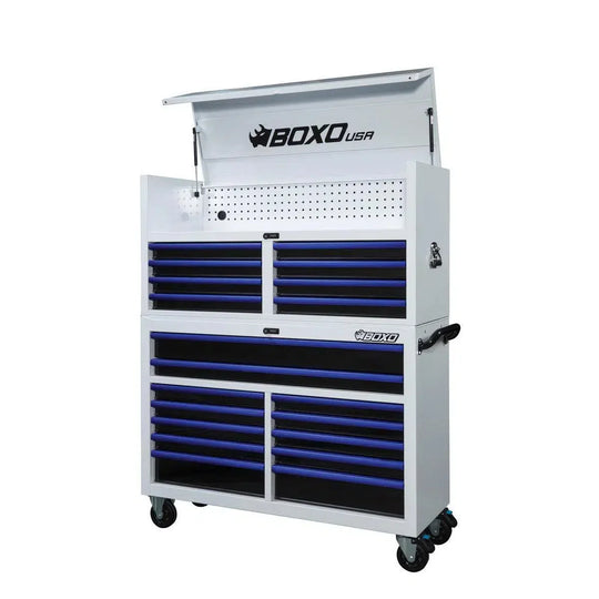 BoxoUSA Pro Series | 53" 20-Drawer Rolling Tool Box | White and Blue