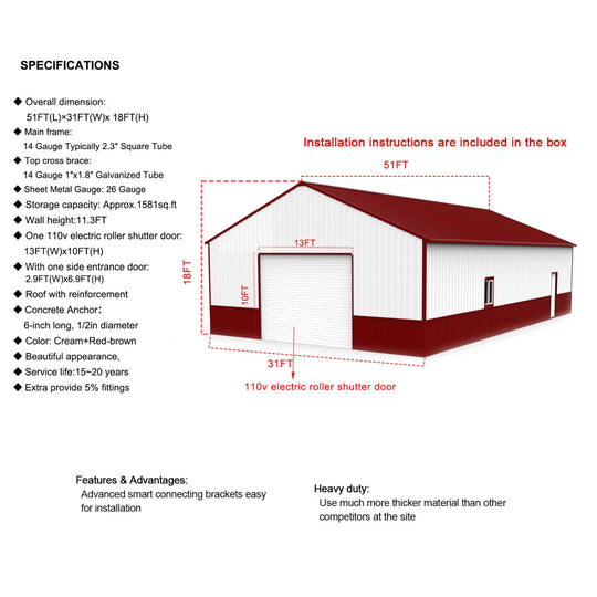 [31X51FT] Heavy-Duty Outdoor Steel Garage Barn Storage Shed (SAK83146)