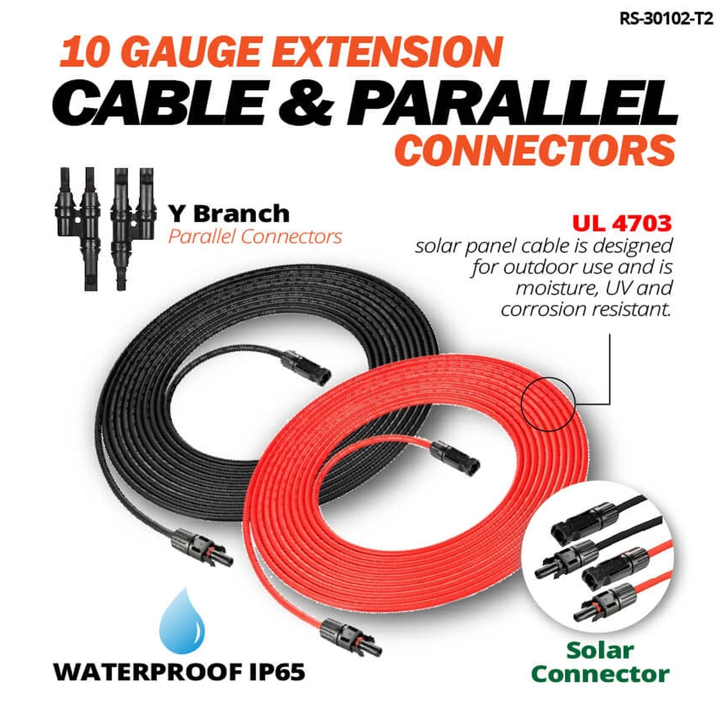 - Complete extension set with red and black 10AWG cables equipped with male and female solar connectors on both ends