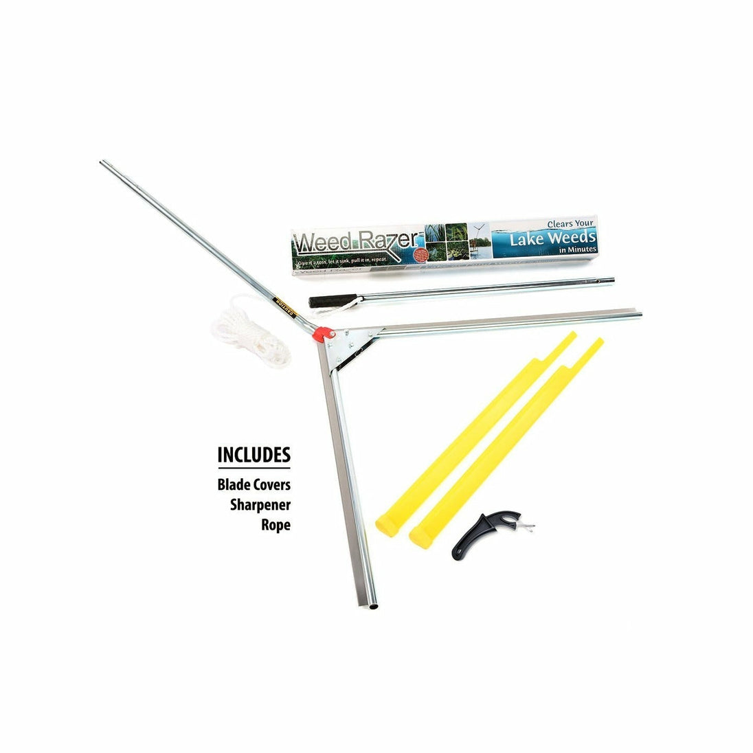 Weighing less than 8 pounds, the Weed Razer is light enough to toss 30 feet or more, yet heavy enough to sink to the bottom. Because the Weed Razer slices weeds at their base, there's no need to drag or tear the weeds as ordinary weed cutters do.