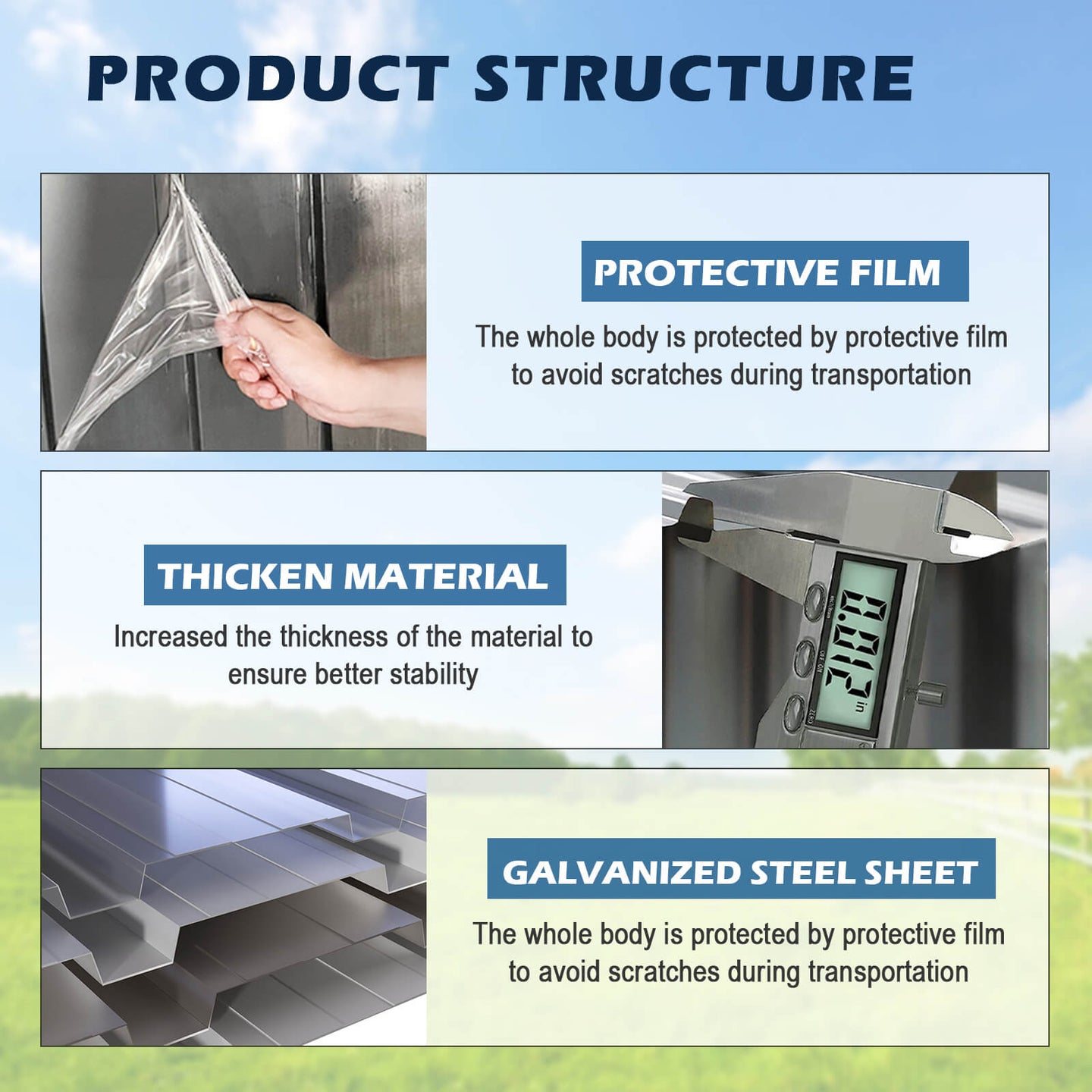 Meet the Metal Storage Shed 13x20ft. It’s built with an anti-UV galvanized steel coating sheet for strength and corrosion resistance. It offers a spacious 13x20 ft storage area for tools, mowers, and gear. Four vents promote air flow and moisture control. It’s designed to be secure and reliable for your valuables.