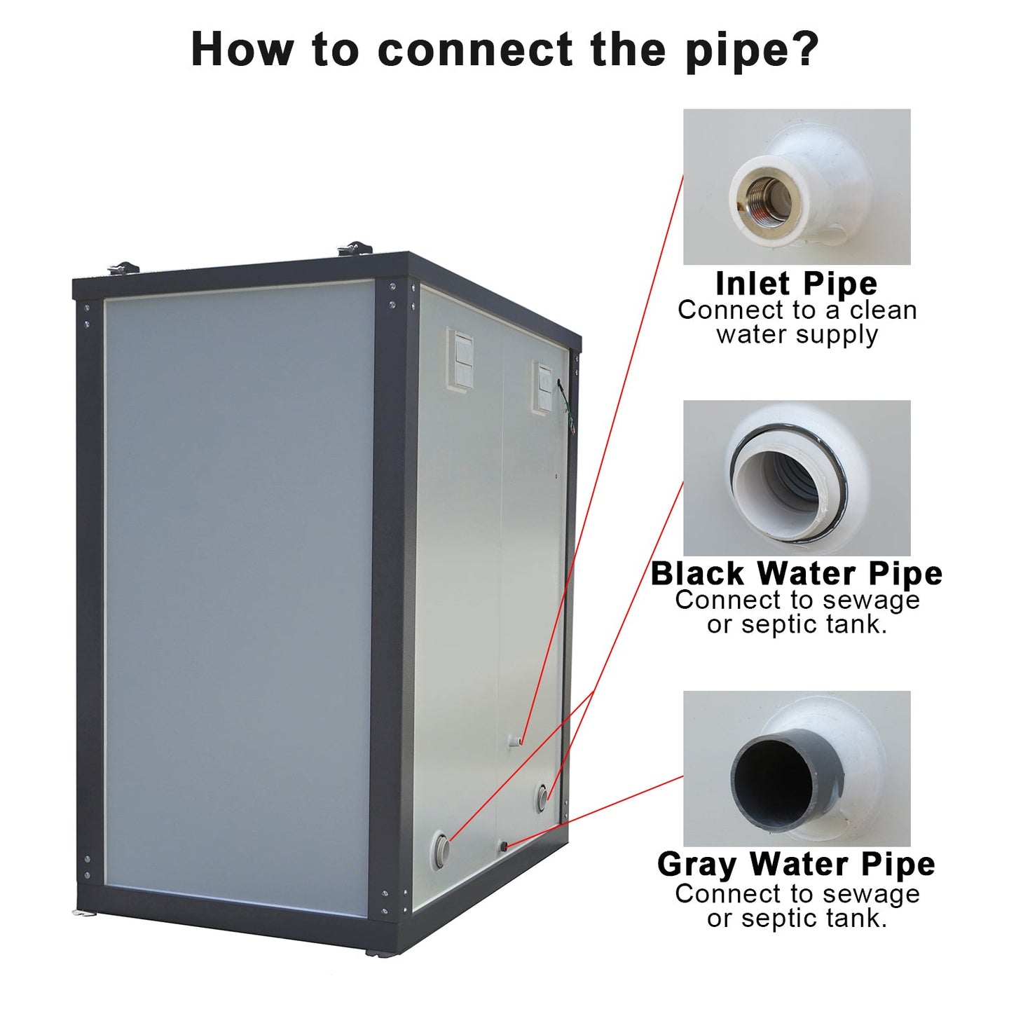 - Outlet Pipe Inner Diameter: Gray Water Pipe 1-1/4"; Black Water Pipe 3".