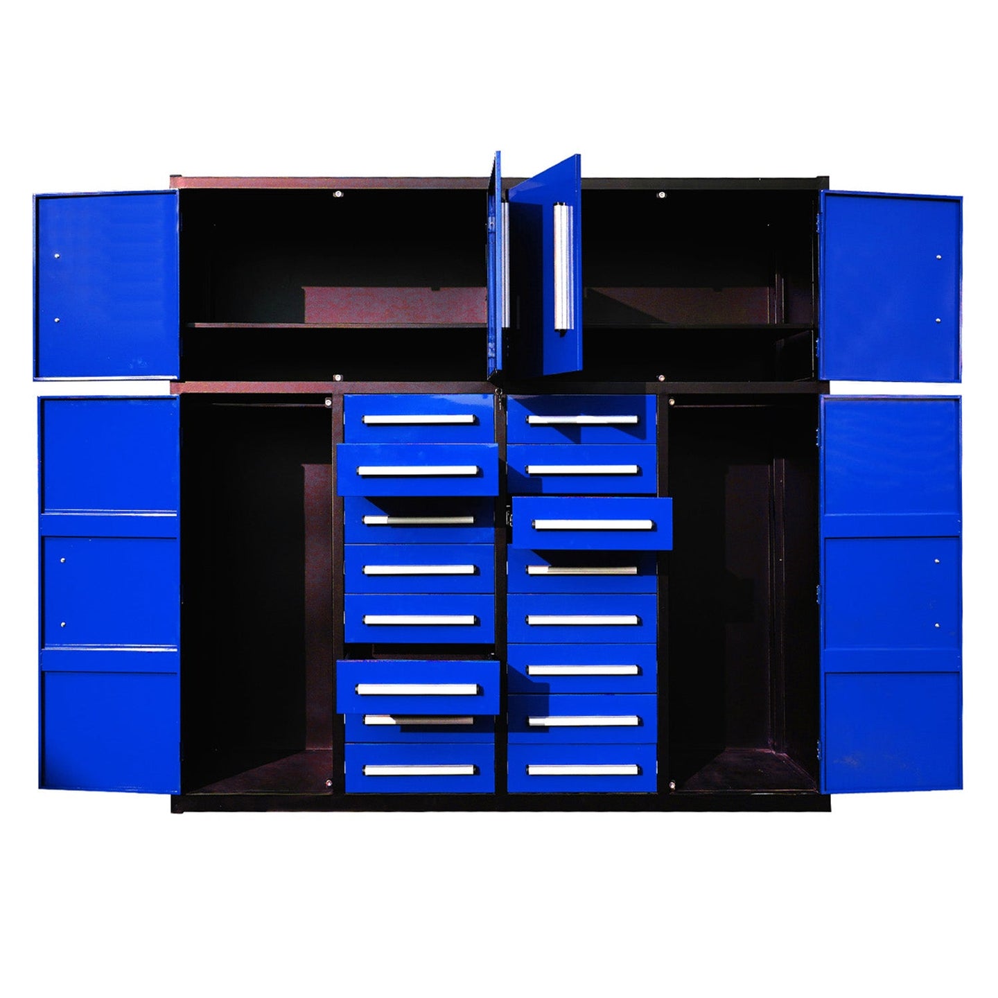 This 7ft storage cabinet holds 16 drawers and four cabinets, giving you space for both big and small items. The top has two large cabinets for bulk supplies. Two long side cabinets offer hanging space to keep clothes clean. 16 drawers keep your garage, workshop, basement, or lab organized. Available in red or blue to match your space.