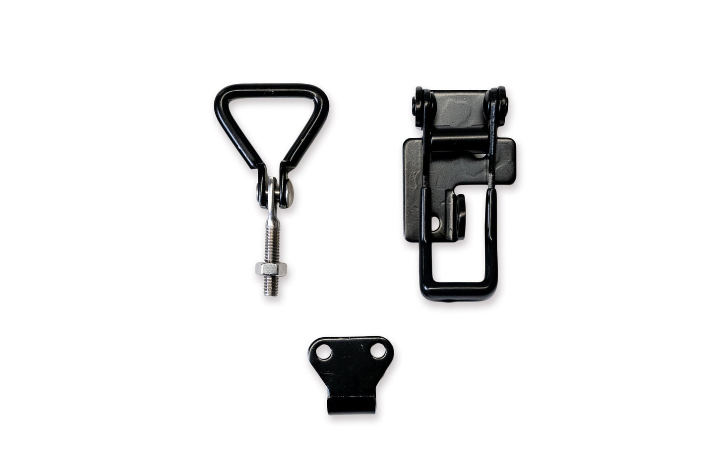 New and improved metal latches for the Evolution/Odyssey/Aspen series rooftop tents. Sold as a set of 4 latches with hardware as pictured for each latch.