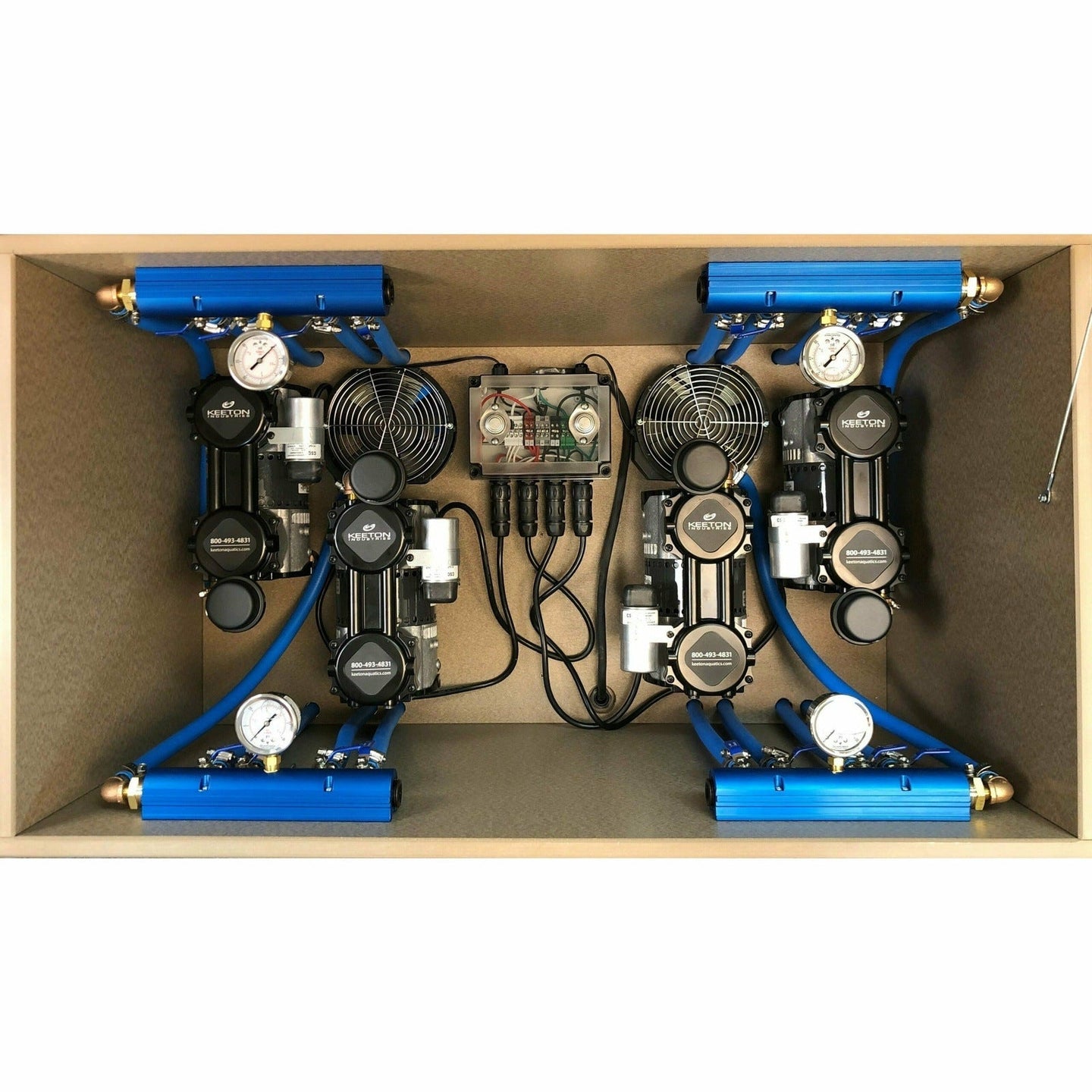 ProLake4 systems offer four powerful ½ horsepower compressors capable of delivering 21.2 cubic feet of air per minute to non-clogging, self-cleaning Duraplate™ diffusers. We top it all off with high volume cooling blowers, and fully adjustable, brushed aluminum manifolds. All housed in a durable, sound-deadening cabinet. The result is a high-end, energy efficient aeration system that will keep your pond clean and problem free for many years to come.