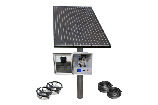 Sale -15%                Vendor: Scott Aerator Scott Aerator | Solar Sub-Surface Aeration System 60-cell, 300 watts, high-efficiency solar module (39" x 65"), with fully adjustable top-of-pole racking. Individual rocker-style circuit breakers High-efficiency, brushless, rocking-piston compressor 2.5 SCFM / 30'+ / 25 psi Brass automatic pressure relief valve Liquid-filled, stainless...Sale price $5,624.00Regular price $6,616.47Sale price $5,624.00Regular price $6,616.47